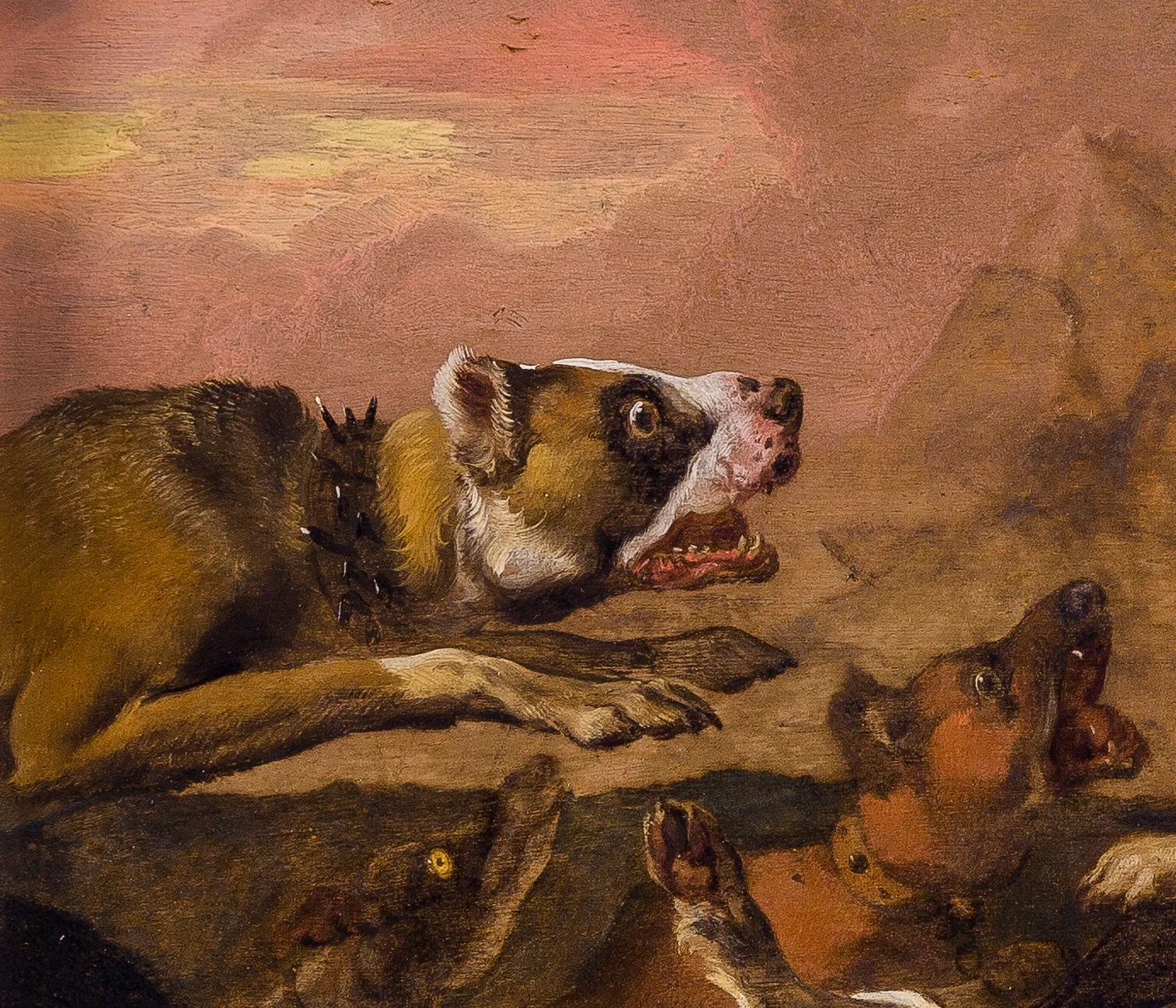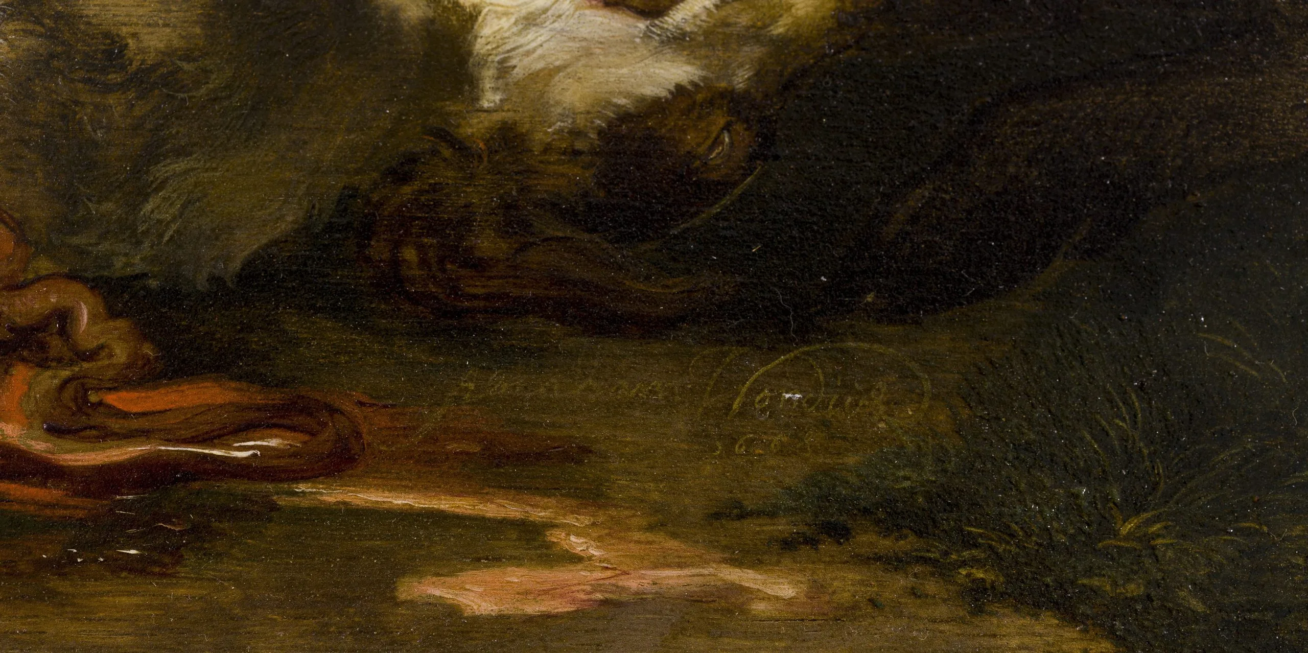 What’s in a name? Abraham Hondius was born as the son of the Rotterdam town sculptor Daniel Abrahamsz de Hondt (meaning ‘dog’, or ‘hound’), and developed into the leading painter of hunting and shooting scenes in Holland, specialising in the depiction of hunting hounds.1 Hunting and shooting were privileges of the nobility, and to make himself more acceptable to his aristocratic patrons, Abraham latinised his family name to the distinguished Hondius, using this version to sign his paintings – beautifully inscribed on this well preserved panel.