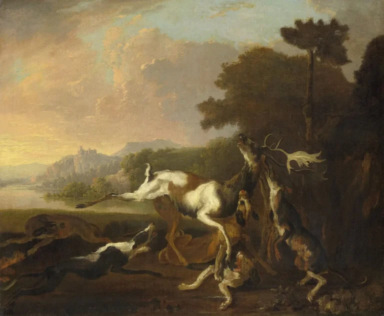The young Abraham is thought to have studied with Pieter de Bloot and Cornelis Saftleven, who had studied in Antwerp for a few years in the early 1630s in the workshop of Peter Paul Rubens. Hondius specialised in paintings with scenes of hunting and shooting, a rare genre in Dutch Golden Age art. Such paintings were however brought into fashion in Antwerp in the early seventeenth century by artists such as Frans Snyders, Paul de Vos and Jan Fyt, who were also active in Rubens’s lively studio, where Saftleven would have encountered their works.