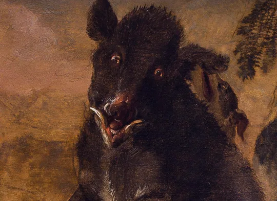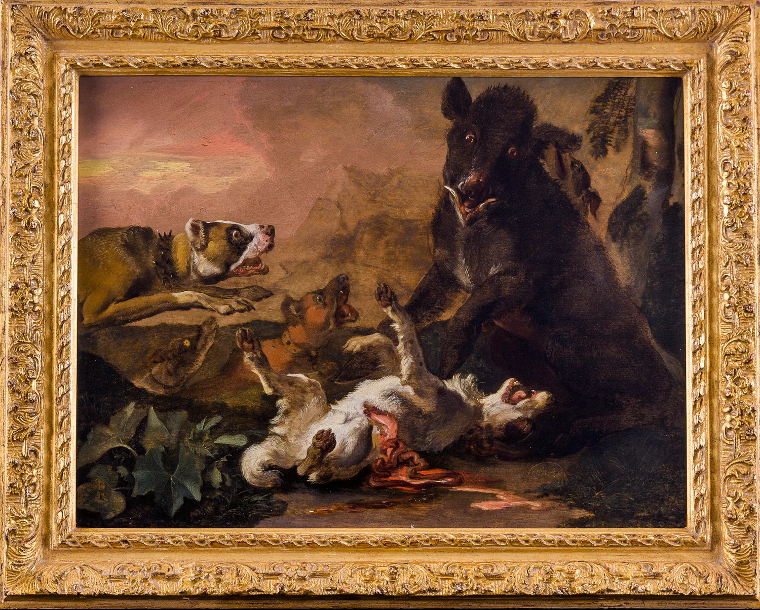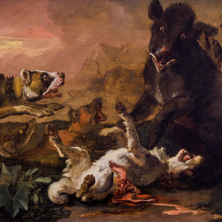 This work is quite exceptional in Hondius’s oeuvre for the closeness of the depicted scene – normally, the artist places the dramatic episode slightly further away in the landscape. This close observation increases the liveliness and excitement of the work. The immediate effect is further enhanced by the dramatic subject matter of the painting, the disgorged central dog, which has fallen victim to the fierce boar. For all their brutality, such scenes were appreciated for their vivacity and sense of excitement. Hondius’s brushwork in this beautifully preserved painting is particularly loose and spontaneous, almost more in character with an oil sketch than a finished painting – in fact, much of the ochre-greyish ground preparation layer of the panel can still be seen in large areas of the finished work, which adds to the freshness and spontaneity of the subject, and shows the painter at his very best. The painting can for instance be compared to Hondius’s Stag Hunt in the Rijksmuseum in Amsterdam (fig.).2