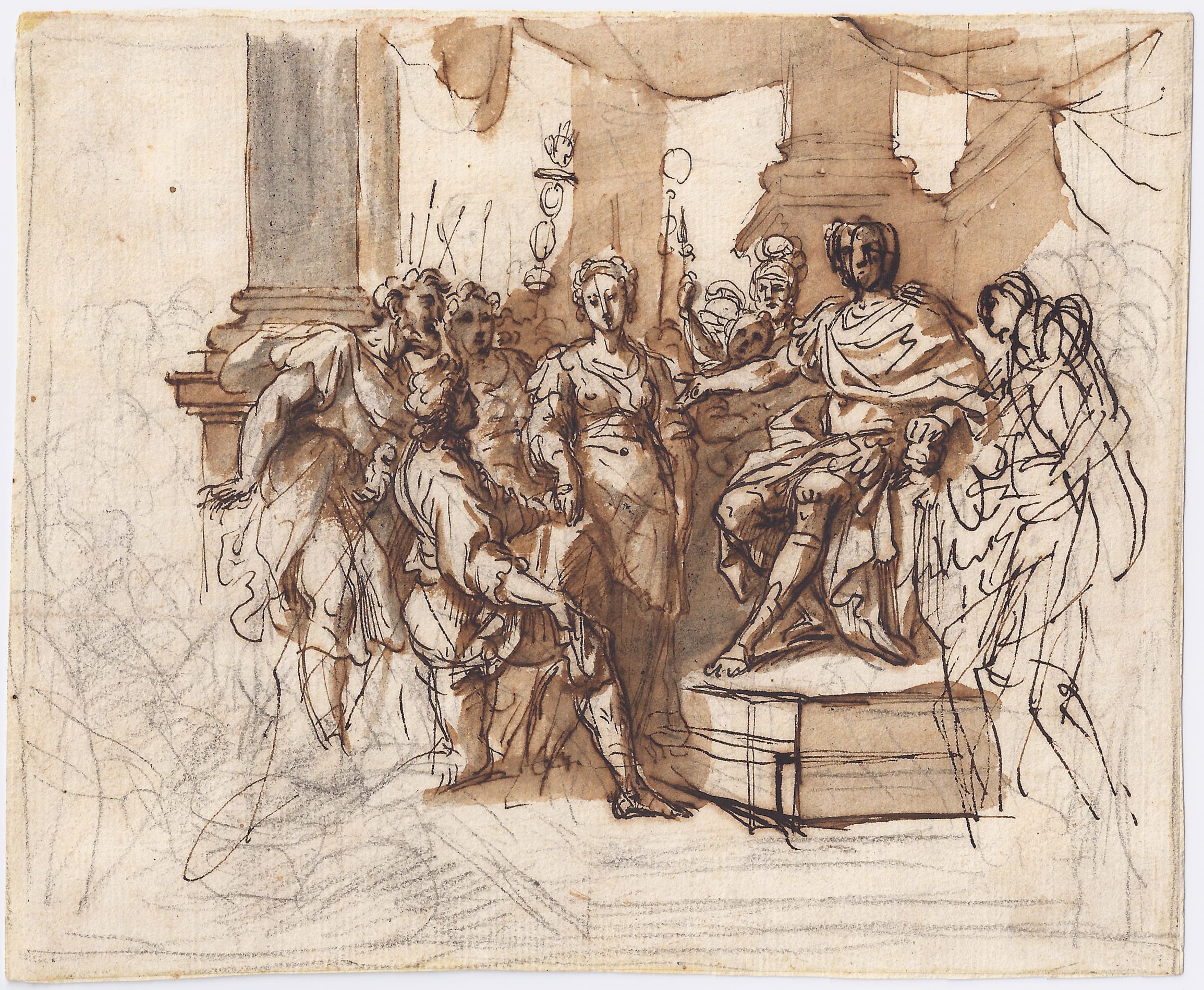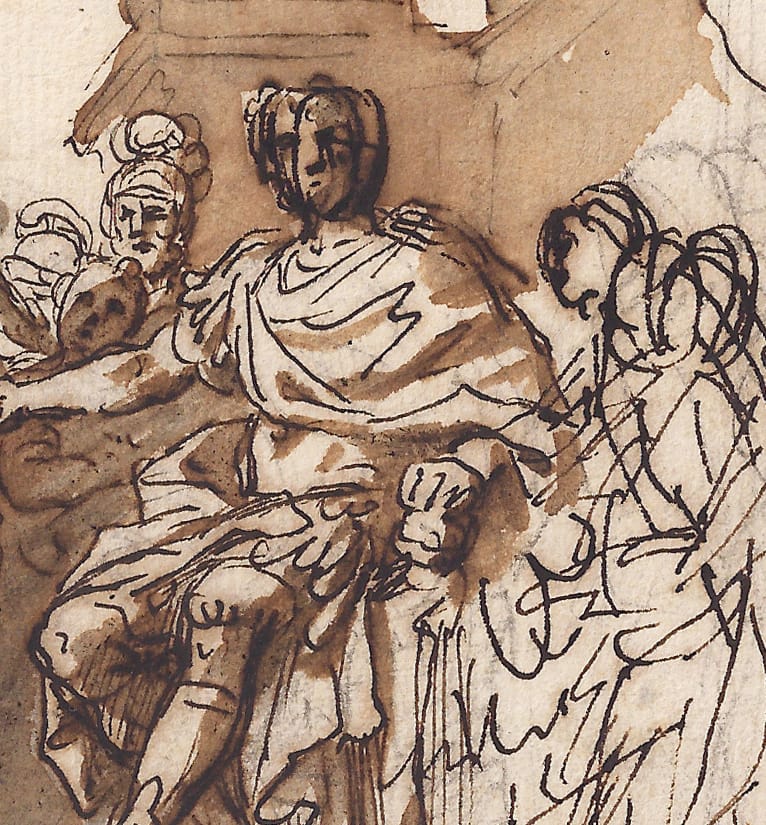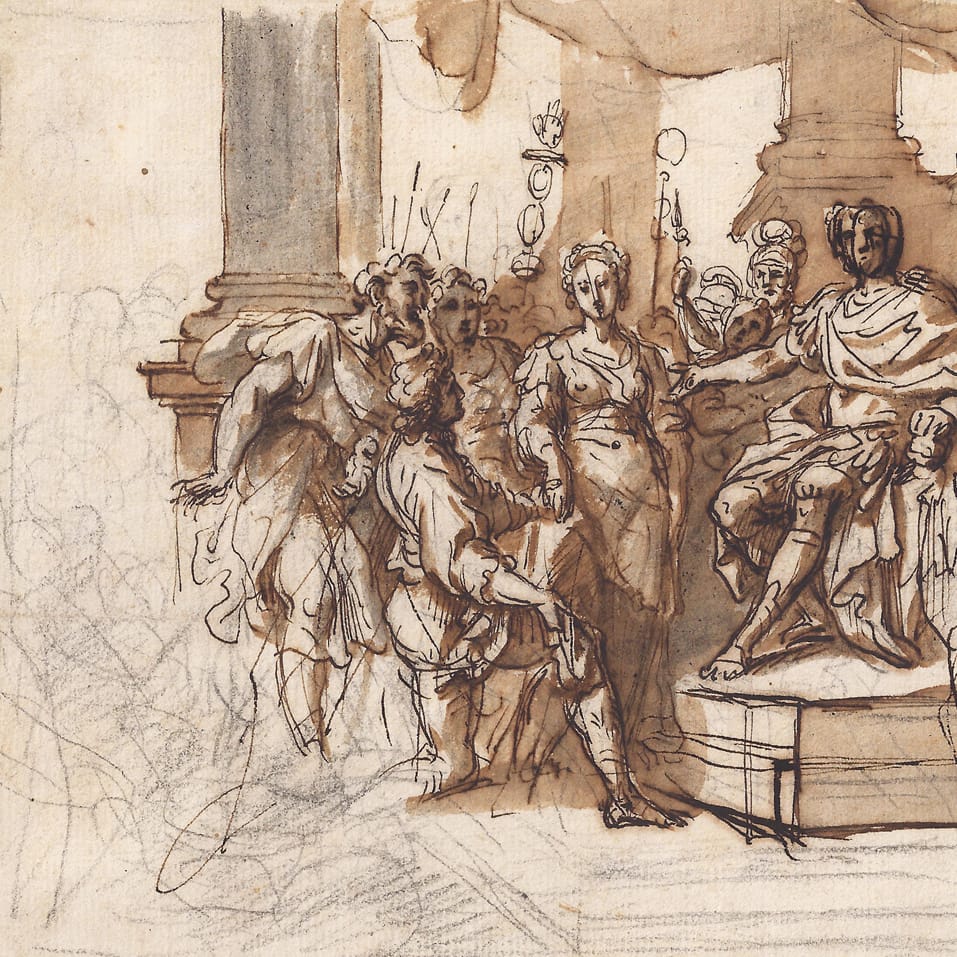 Pompeo Batoni, one of Masucci’s pupils, must have known this composition by his master, either from this drawing, or from a resulting painting by Masucci, now lost. His own painting of The Continence of Scipio clearly pays tribute to Masucci’s treatment of the theme (fig.). The painting was commissioned by Count Chouvaloff for Empress Catherine the Great in 1768 and is now in the Hermitage, St. Petersburg.2 It is interesting to note that Masucci died just around the time of the commission and it is just possible that Batoni acquired or inherited some of his former master’s drawings.