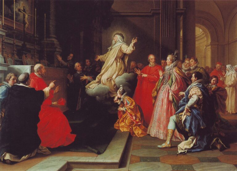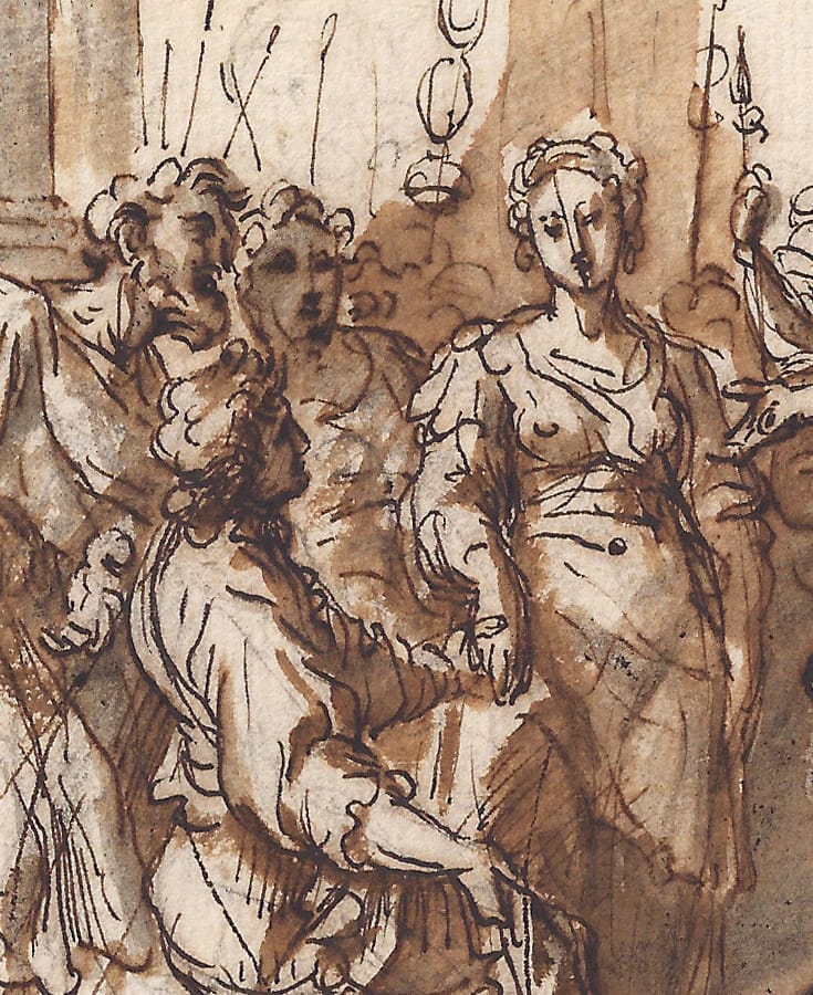 This recently discovered drawing is executed in a particularly painterly style, in which the artist very swiftly sketched initial thoughs in black chalk, and proceeded to work out the main scene in pen and brown ink, adding wash to give depth to the composition. Masucci drew the face of Scipio in two positions, which illustrates how the artist worked out the composition in this working drawing, presumably a design for a painting. The kneeling figure in our drawing may be compared to a similar figure, albeit in reverse, in Masucci’s painting The Ecstacy of St. Margherita de’ Ricci in the Galleria Nazionale d’Arte Antica, Palazzo Corsini, Rome (fig).