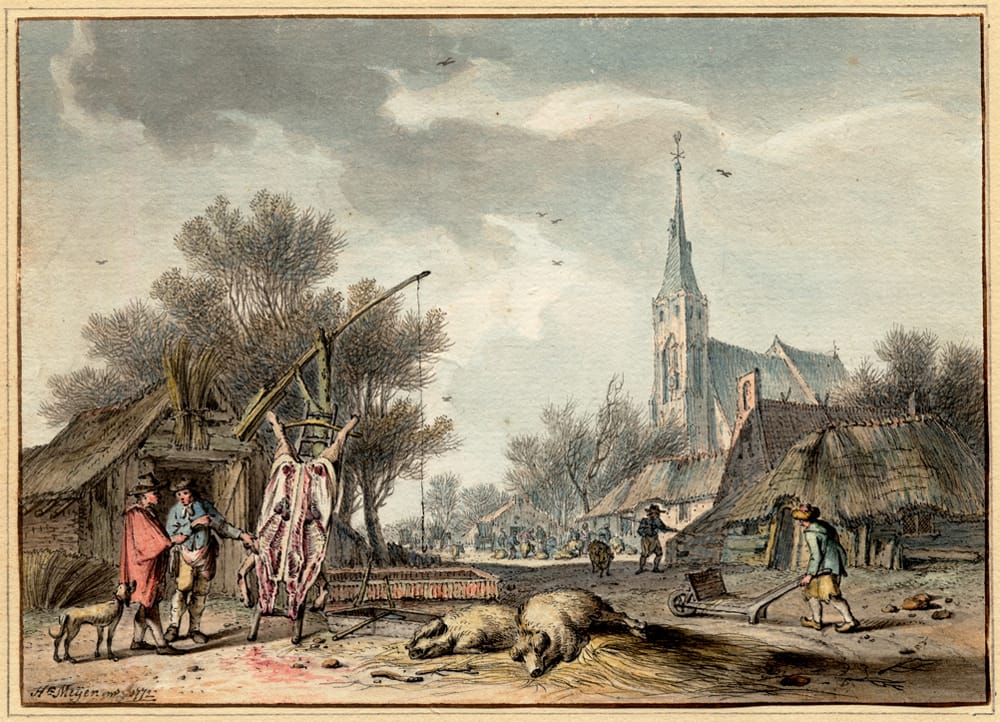 From references in early sale catalogues it is known that Meijer drew several series of Months. In addition to the present beautifully preserved set, only a single other series is known, in the Metropolitan Museum, New York.5 The Metropolitan Months are of almost identical composition to ours, differing only in minor details of architecture and figures, colouring and position of the birds. This Metropolitan set is also dated 1772, the same year as our series, and the two series were probably made alongside or shortly after each other – it is possible Meijer suspected a willing market for such an attractive series, or that a collector commissioned a duplicate set after having missed the possibility to acquire the first. Sheets from both the present and the Metropolitan set are annotated ‘inv.’, an abbreviation of ‘invenit’, meaning ‘invented’, to indicate that Meijer had designed the compositions himself. However because both sets bear this inscription, it is impossible to say which was executed earlier. In terms of execution, the present watercolours are of comparable quality to those in the Metropolitan, although in the New York sheets certain details have been excluded (for instance the pool of blood underneath the pig’s carcass in November). Our set is however far better preserved, with colours as fresh as when they were made, while the Metropolitan set appears rather discoloured, and the edges of most Metropolitan Months are damaged.