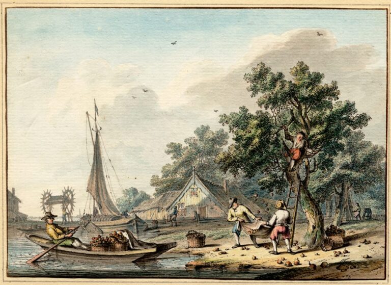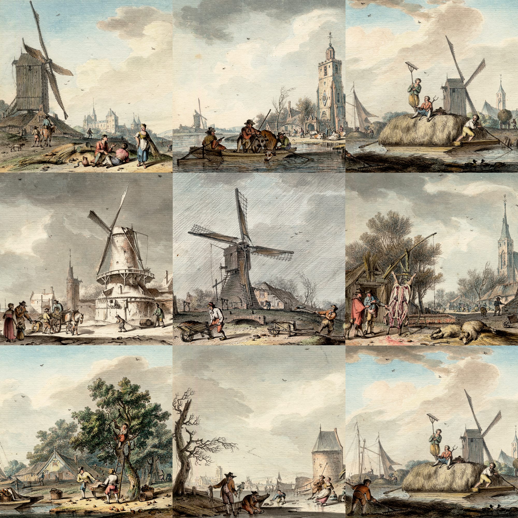 January (Aquarius) or ‘snow month’ shows a frozen canal on the outskirts of a town with men and women skating and enjoying themselves; February (Pisces) or ‘rain month’ shows a rain-swept rural landscape with a windmill and labourers shovelling earth; March (Aries) or ‘spring month’ shows a view of a farmhouse with haystack and a oxen-drawn plough; April (Taurus) or ‘grass month’ shows a country church with a cattle on a ferry in the foreground; May (Gemini) or ‘bloom month’ shows a village street with a women selling vegetables and a peddler in the background; June (Cancer) or ‘summer month’ shows shepherds herding their flock on a sunny day; July (Leo) or ‘hay month’ shows recently harvested hay being ferried way; August (Virgo) or ‘harvest month’ shows wheat being harvested; September (Libra) or ‘autumn month’ shows a ‘Zaanse’ farmhouse with apples being gathered; October (Scorpio) or ‘wine month’ shows labourers resting after a day of picking grapes; November (Sagittarius) or ‘slaughter month’ shows recently killed pigs; December (Capricorn) or ‘winter month’ shows the outskirts of a town with wood being gathered to warm the chilly homes.