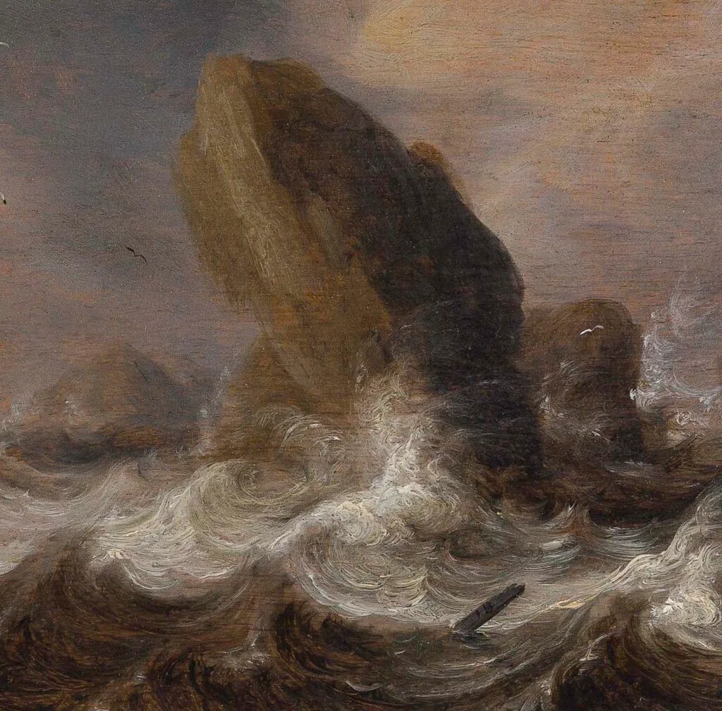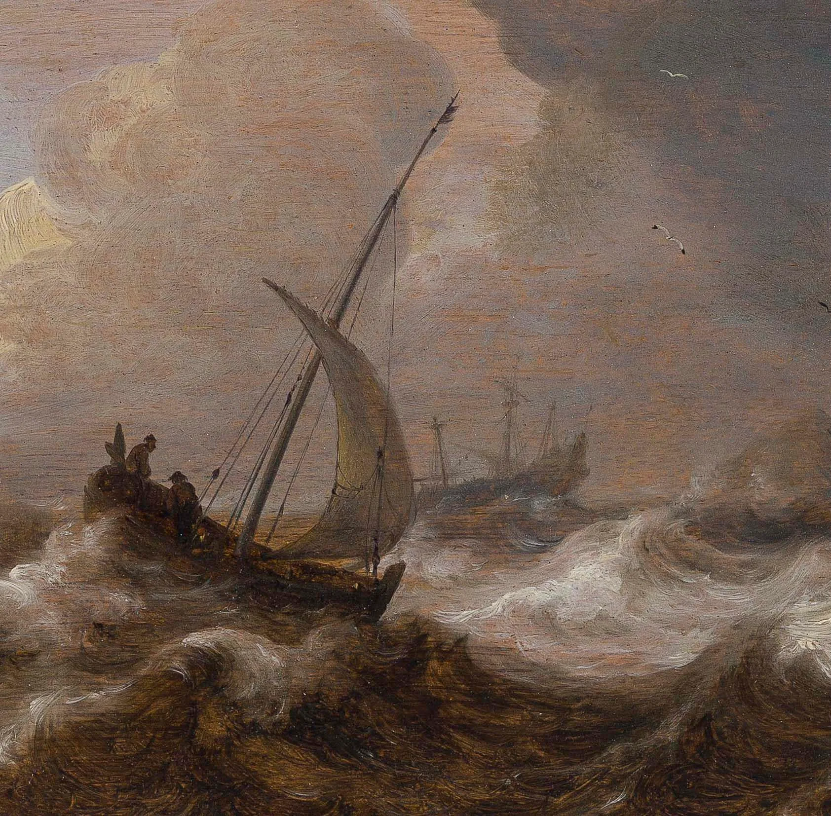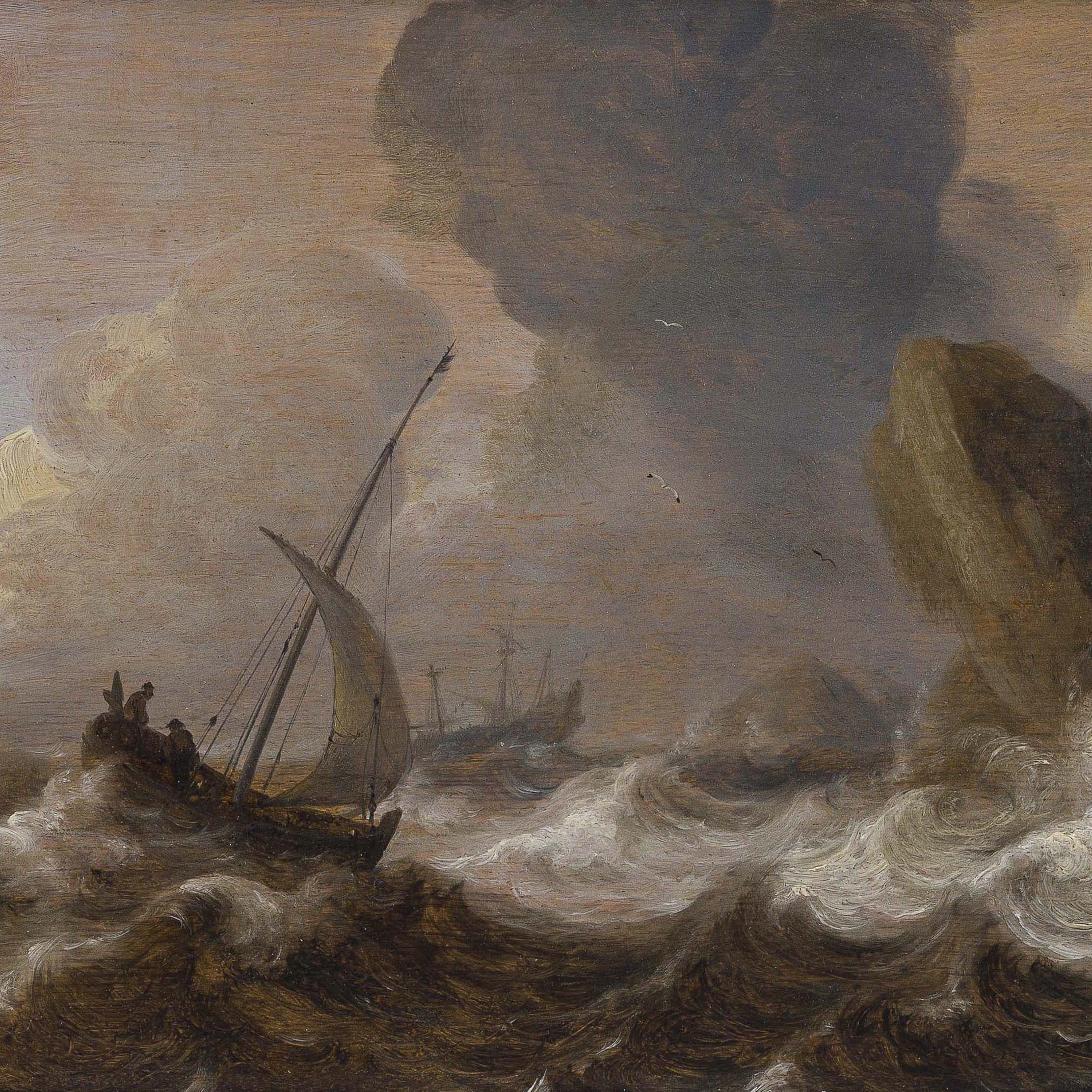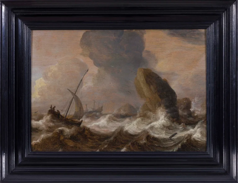 In this beautifully preserved panel, Porcellis has depicted a turbulent sea with a pink with three fishermen approaching a rock formation, while a threemaster with lowered sails is seen in the distance – this vessel, also known as a pinnacre, has lowered the sails in order to protect them from the stormy winds. Painted with a spontaneous yet highly assured technique, the artist was able to convey the sense of a turbulent sea scene with utmost confidence. It has been observed that Julius’s paintings can be discerned from those by his father by the more elongated, less compact figures, which are more robust and with notable accents of colour in the works of Porcellis Senior, and the relatively simple depiction of the cloud formations. The present is datable around 1635, a fews years before the artist’s early demise, when Dutch marine painting was still dominated by the monochrome movement, painted in hues of grey, brown and blue – only after the middle of the century marines tended to become more colourful, with stronger colours.