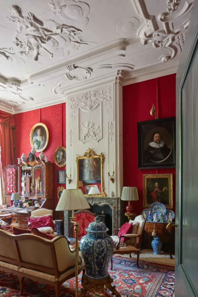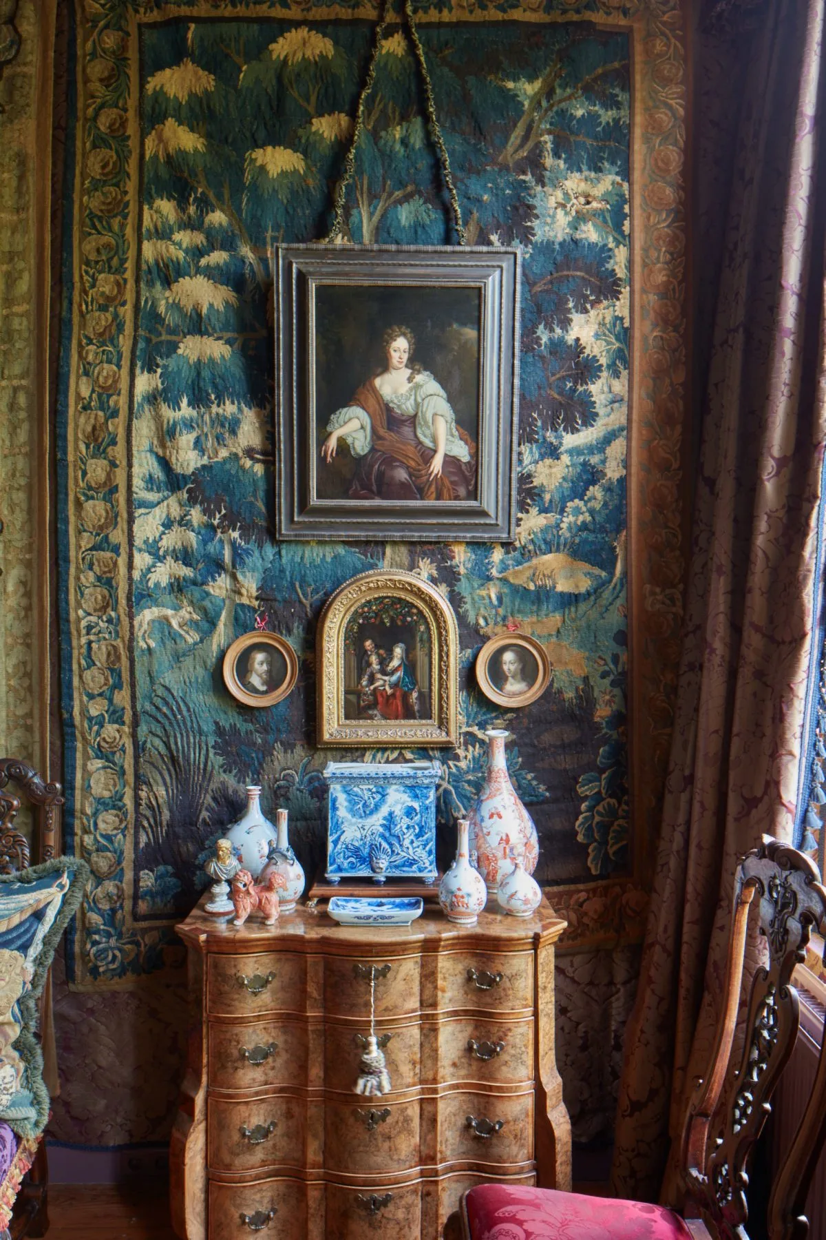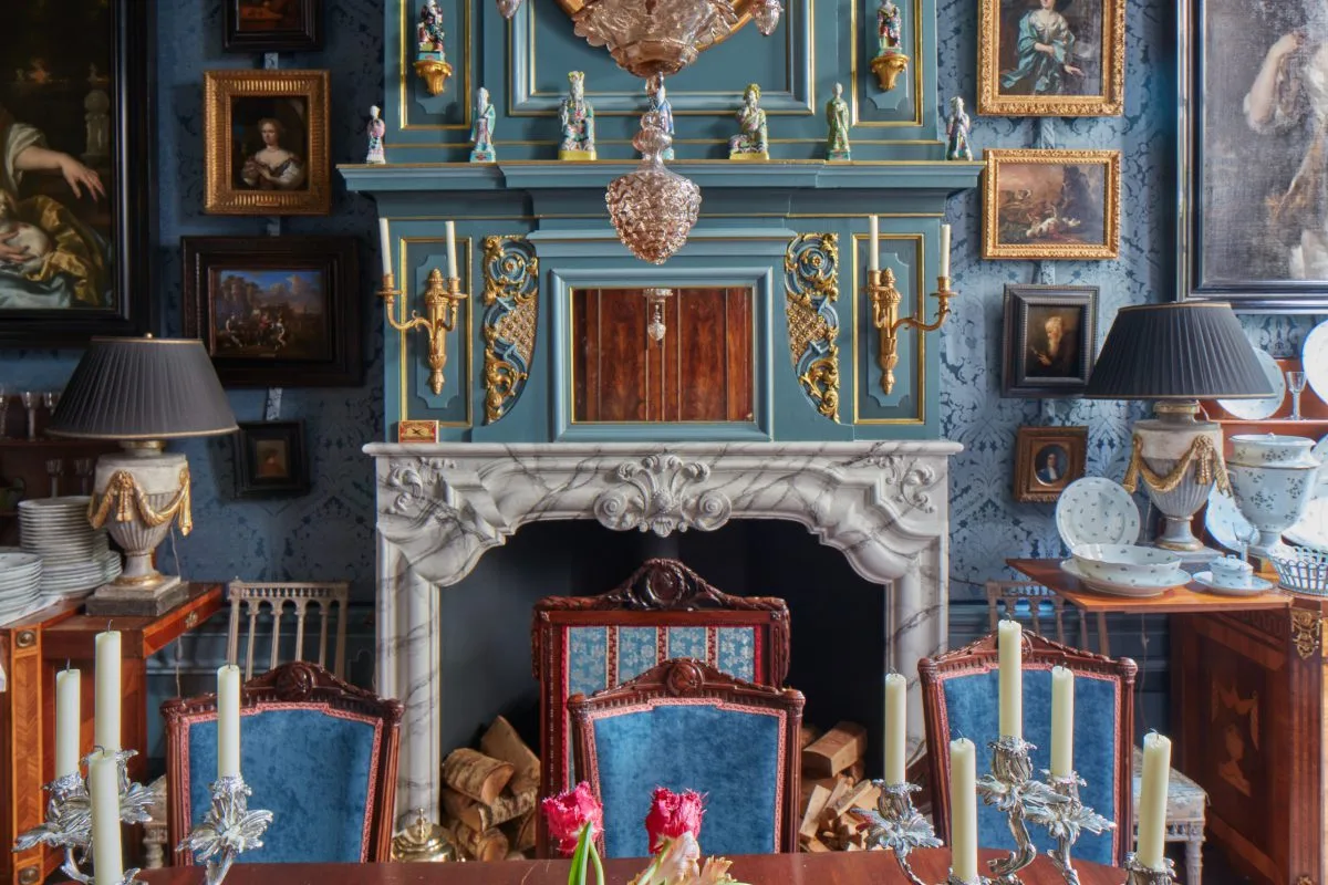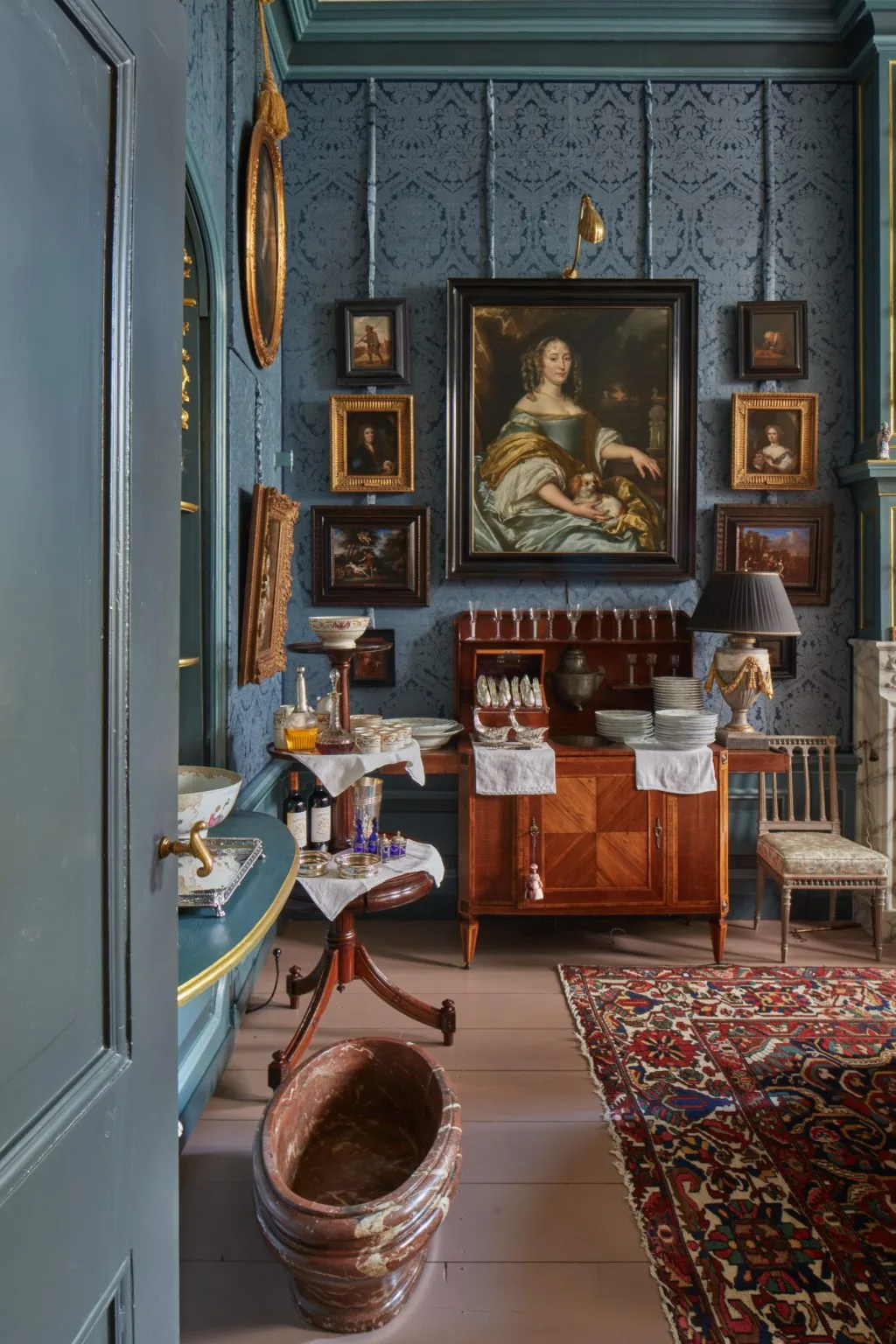 White Rose Fine Art’s paintings are presented in the historic interiors of the house’s main floor, notably in the Red Salon overlooking the canal, overseen by a spectacular stuccoed ceiling of c.1740, representing the Goddess Primavera, and in the Blue Dining Room, with its rare survival of an original carved buffet cupboard, again dating from the same period, and in the magnificent ‘Zaal’, the largest room in the house, overlooking the town garden. In recent years the whole house has been meticulously restored and decorated according to eighteenth-century taste, complete with silk-upholstered walls and furnished with period furniture and decorative arts.