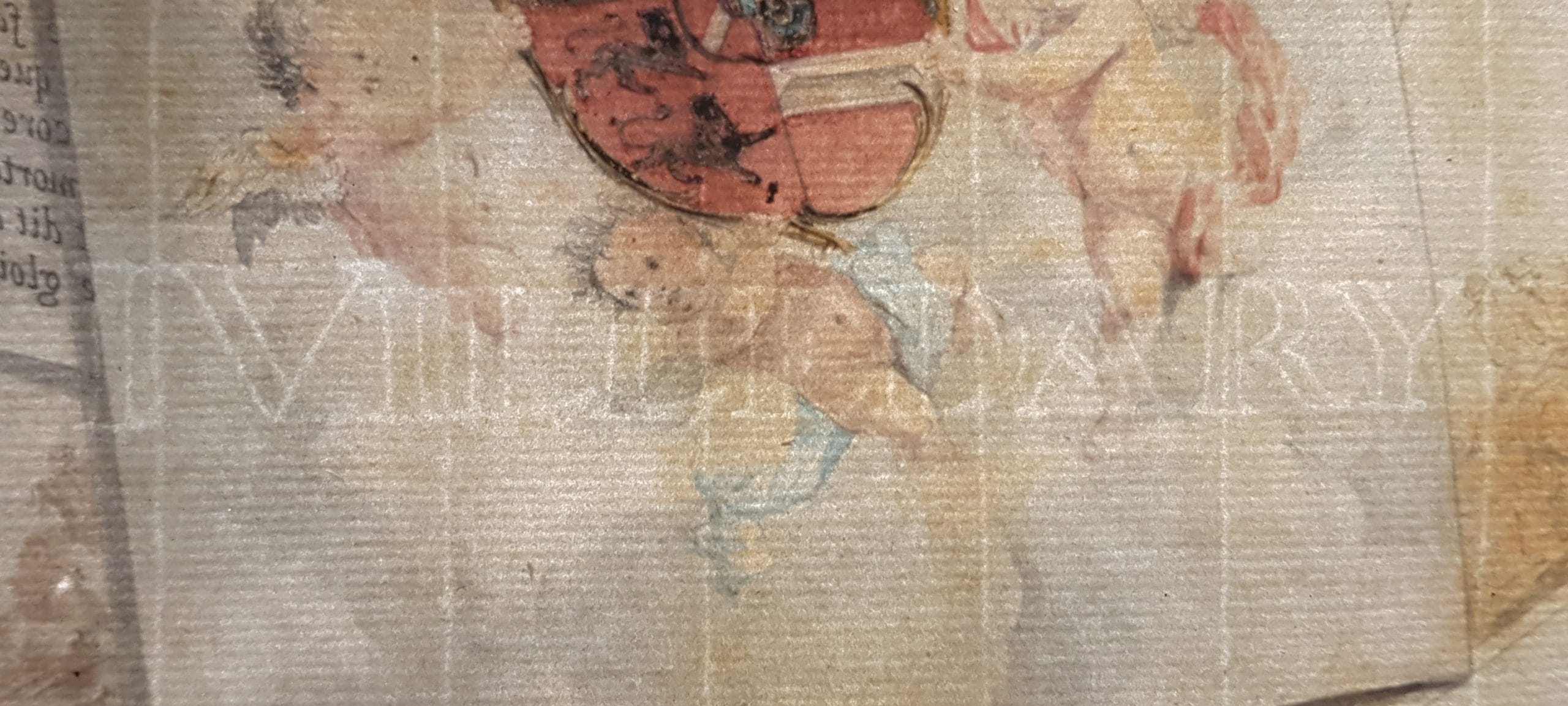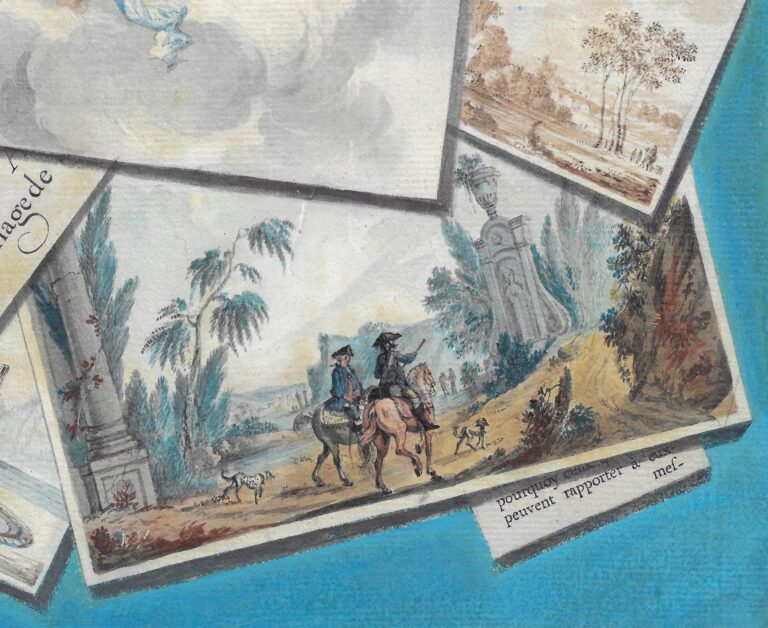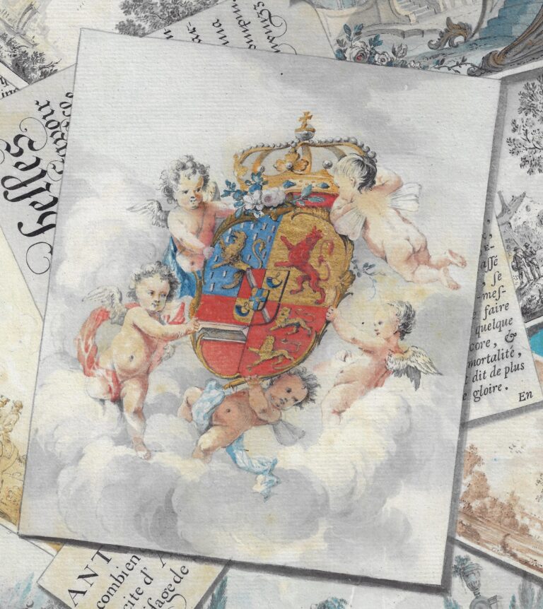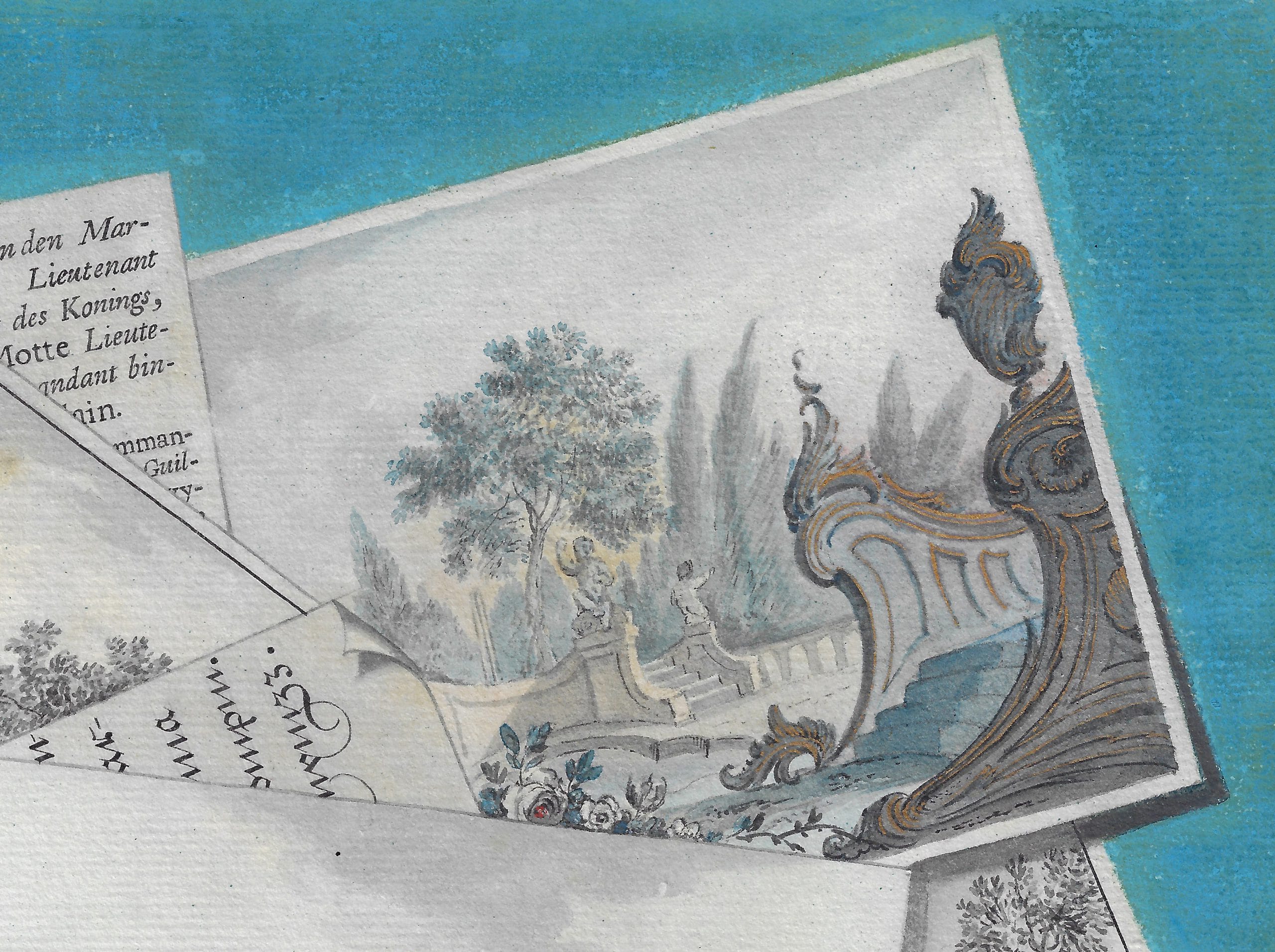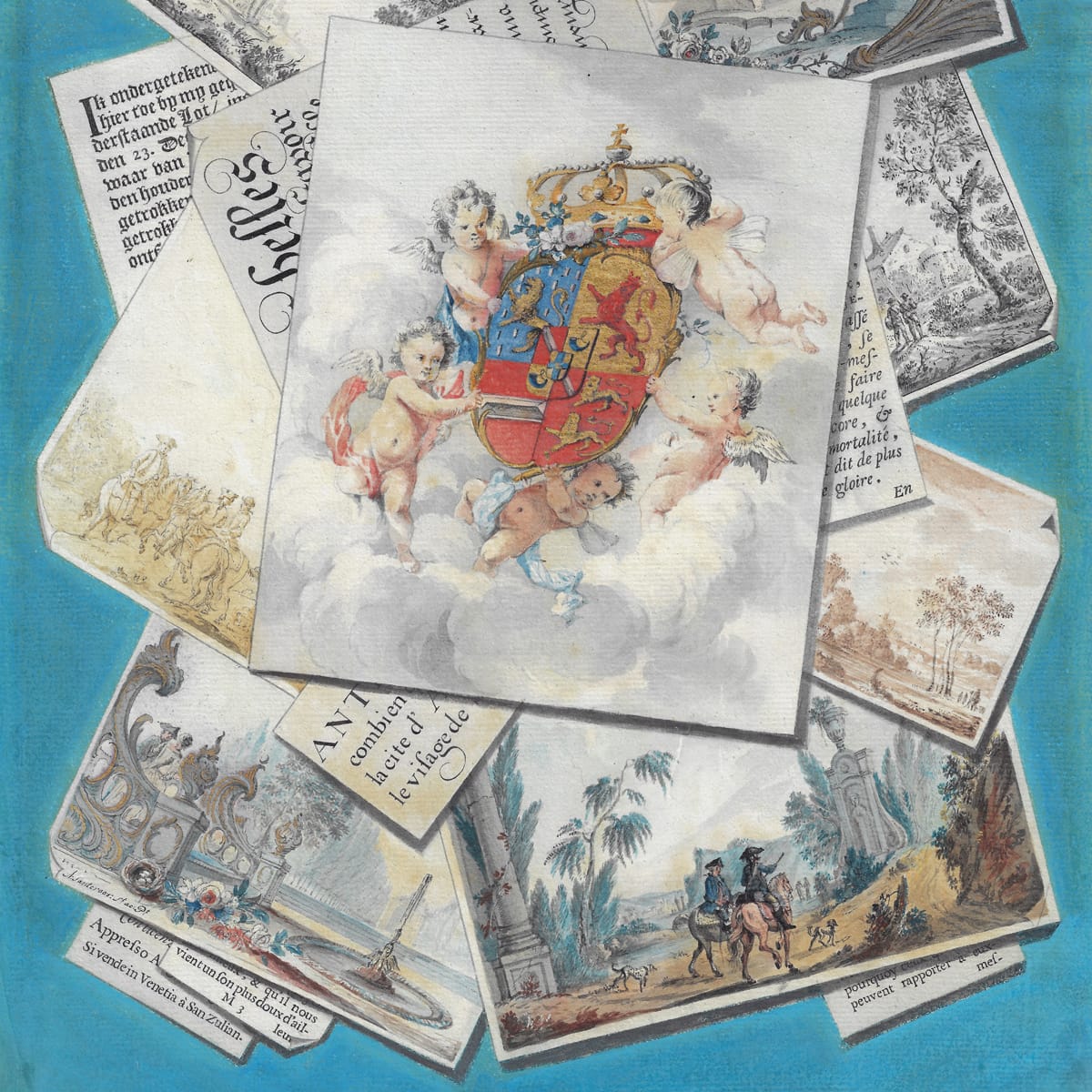 The present elaborate watercolour is a tour de force of trompe l’oeil, an assemblage of various illusionistically rendered ‘pages’ around a central ‘sheet’ with putti drawn in the style of Jacob de Wit, holding the arms of the Orange Nassau family, partially executed in gold. The other ‘pages’ include trompe l’oeil ‘printed’ sheets, showing Santcroos’s meticulous skills in calligraphy, doubtless the result of his activities as a copperplate engraver. Other ‘drawings’ and ‘watercolours’ are executed in the styles of other draughtsmen of the period. We can only speculate as to the reason of the inclusion of the Orange Nassau arms: the sheet could have been specially commissioned by a fervent supporter of the Stadtholderly family.