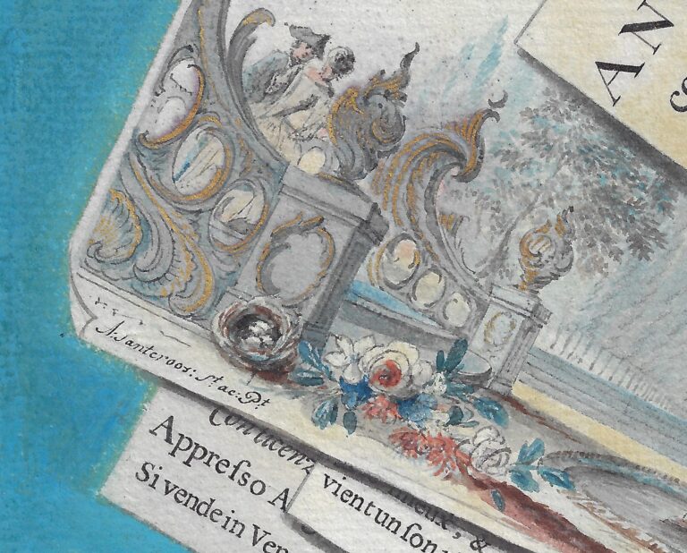 Aaron (or Ahron) Santcroos, also known as Sanctcroos, was an engraver of Jewish Portuguese descent, working in Amsterdam around the middle of the eighteenth century.1 Santcroos engraved title pages for the Hebrew Bible Chamishah Chumshei Torah: Tikun Sopherim, published in Amsterdam by Leib Soesmans in 1768; the great edition of the Talmud Bavli, published in Amsterdam from 1752 to 1768; and the Book of Ezra the Scribe, Sefer’Ezrat Hasofer, Hamishah Humshei Torah, published in Amsterdam by G.J. Janson for Israel Mondovy, 1767-69. The last dated work by Santcroos is a similar ‘bedriegertje’ with various trompe l’oeil ‘printed’ pages, drawings and watercolours arranged around the titlepage of the play Sabinus en Eponina by Jan Haverkamp, fully signed and dated 1791, which surfaced recently and is now also in the collection of White Rose Fine Art.2