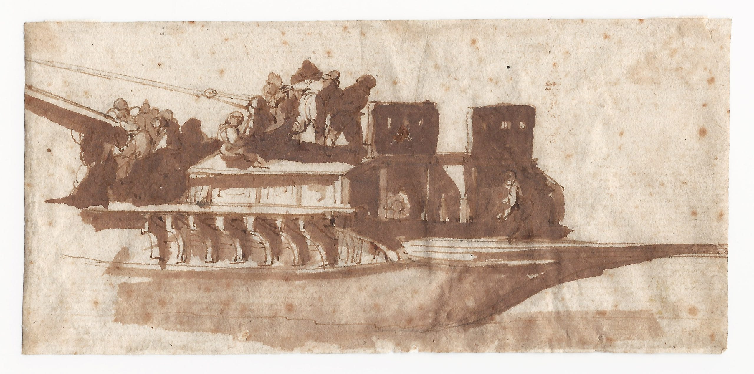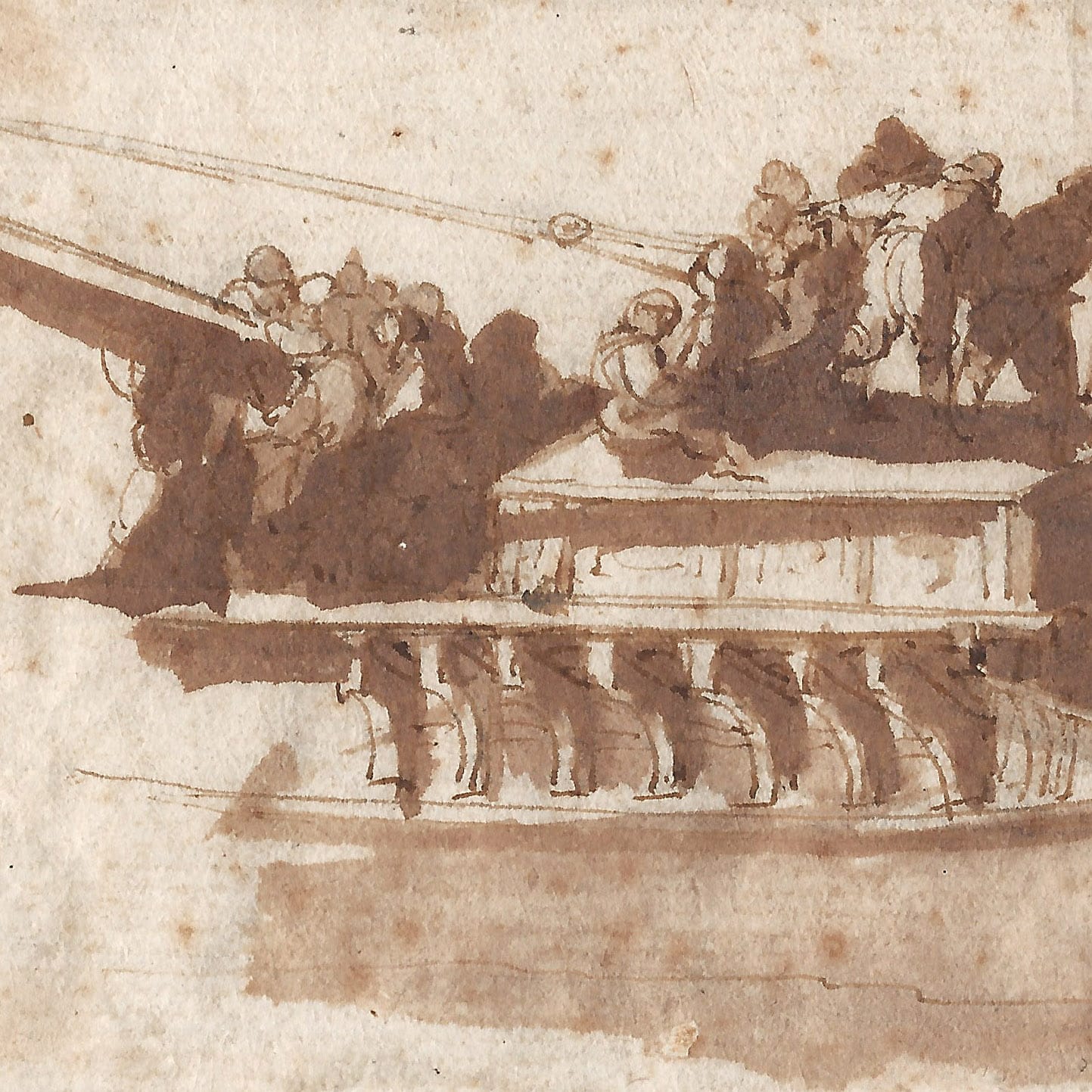 This small yet vigorous sketch belongs to a group of drawings depicting ships and harbour scenes that was owned in the middle of the eighteenth century by the Roman sculptor Bartolommeo Cavaceppi (c.1716–1799), and was purchased in 1844 by the Staatliche Museen in Berlin.1 Upon deaccessioning by the Berlin museum the group has been dispersed, with some sheets now in the Fitzwilliam Museum, Cambridge,2 and others in private collections.3