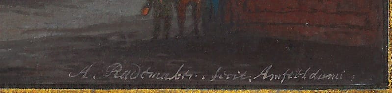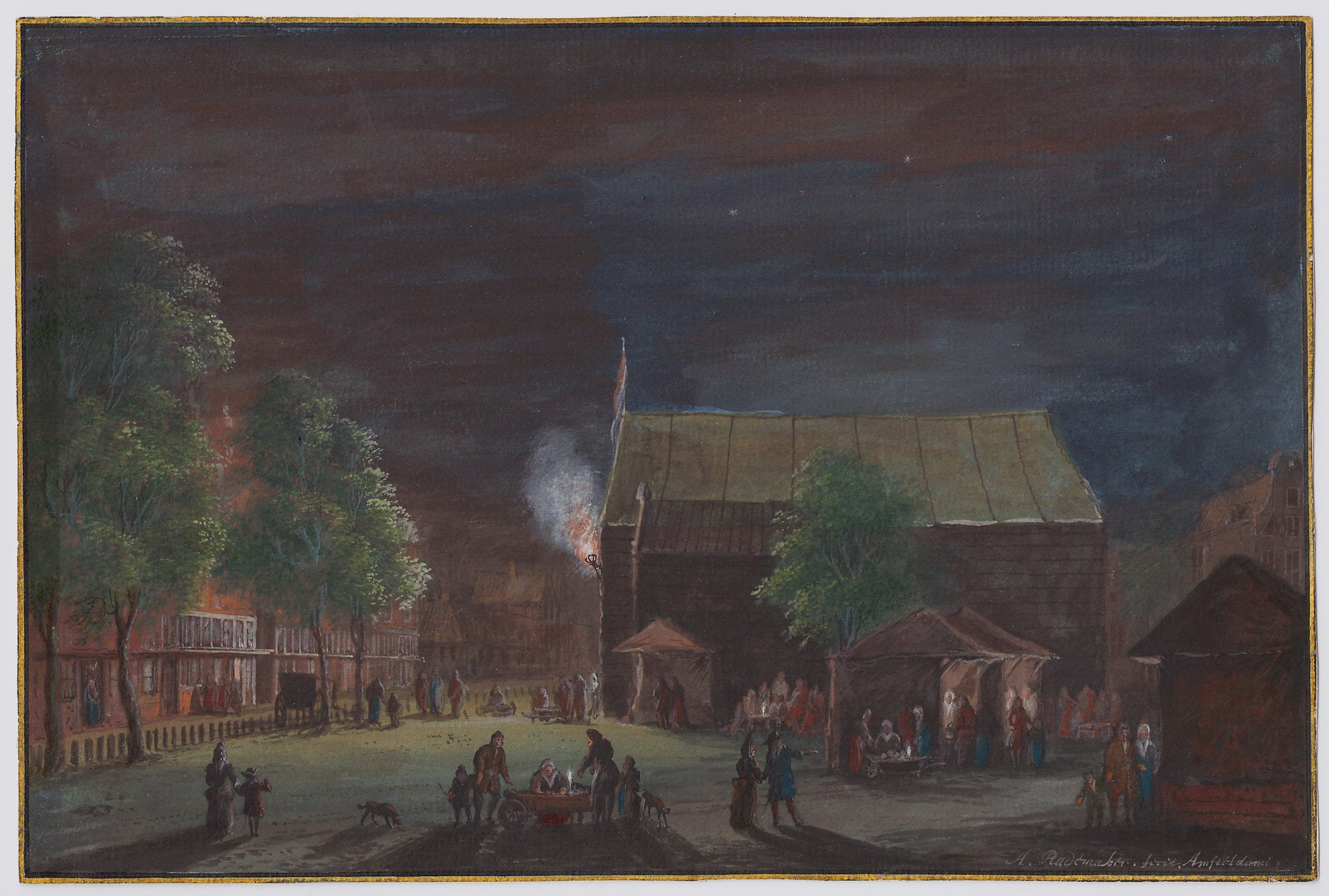 It is rare for Rademaker to use the watercolour/bodycolour technique for actual topographical representations, in general he reserved this technique for imagined scenes. A highly comparable view of a nightly house fire on the corner of the Dam square and Kalverstraat of c. 1720 is preserved in the Amsterdam City Archives.4 This sheet has an identical signature and inscription to our drawing, also in white paint.