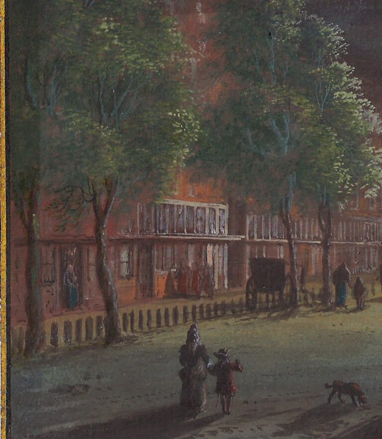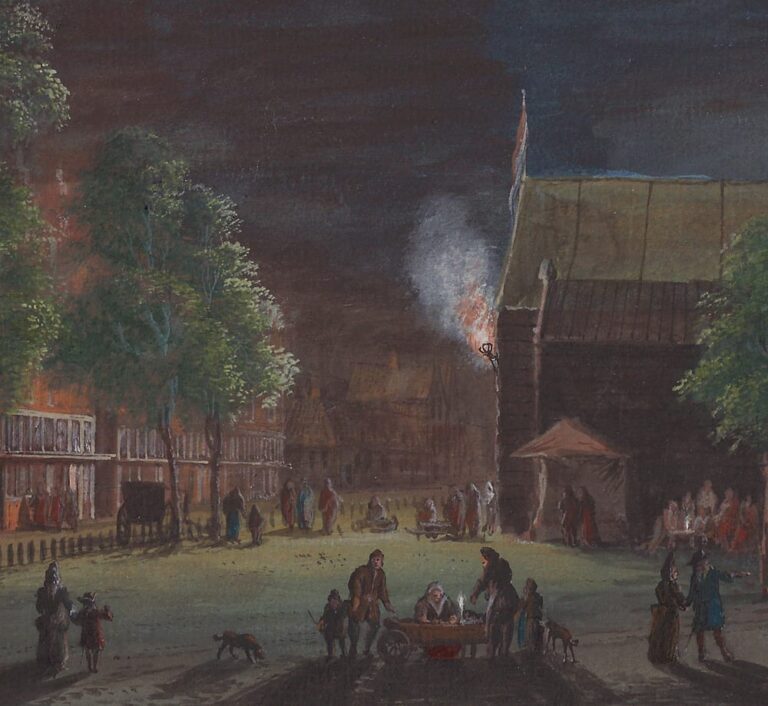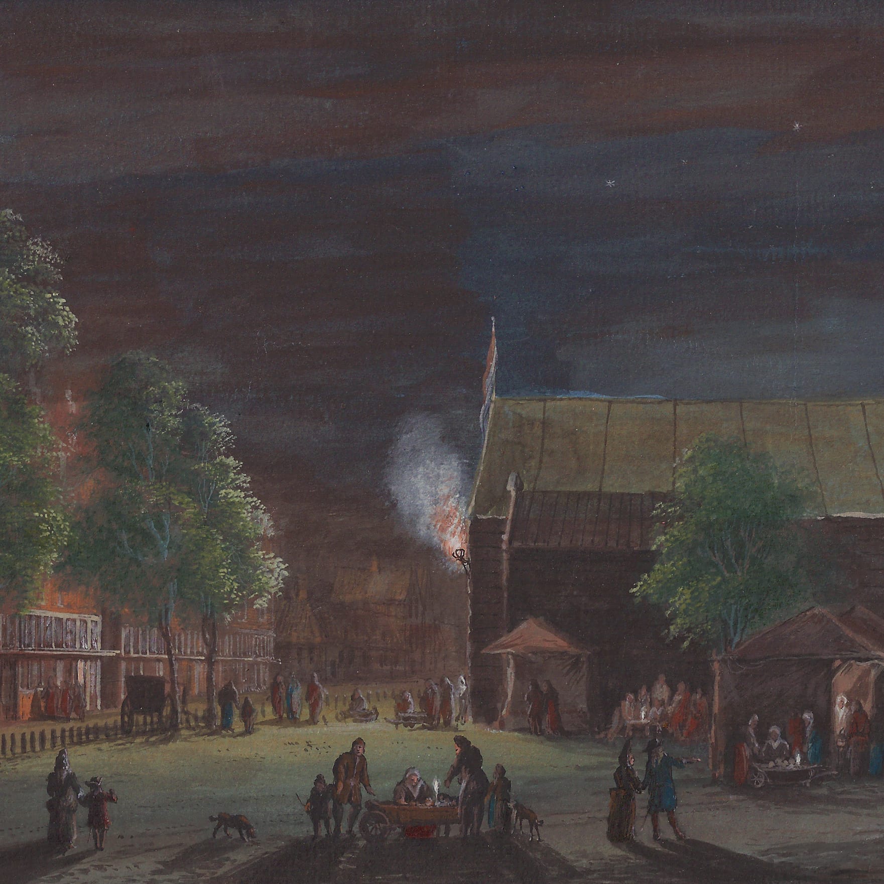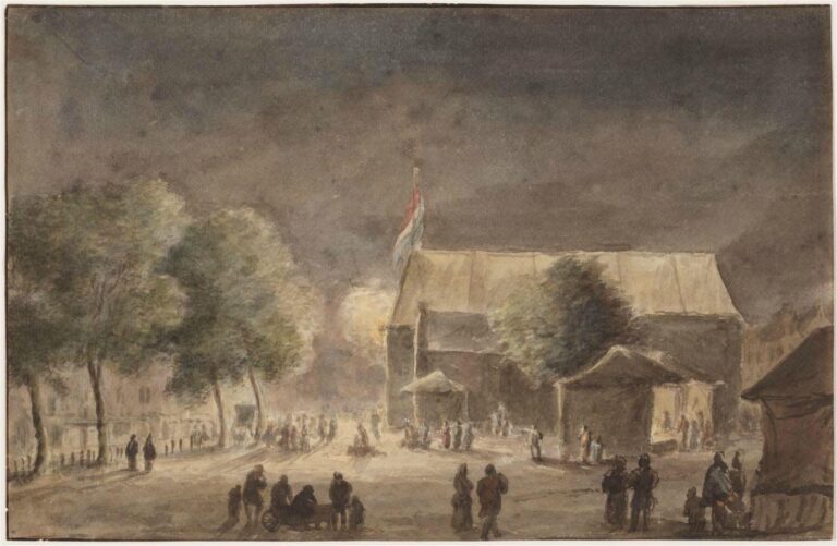 Another version of this composition by Rademaker dating to c.1710 is preserved in the Amsterdam City Archive (see last fig.).3 This drawing is not signed and is executed in almost monochrome washes, and varies in small details, such as the groups of figures – it also appears more quickly executed and it probaly served as the model on which our more finished drawing was based. The thrill of the nightly spectacle is certainly much more powerfully expressed in our drawing with its vibrant colours and dark evening sky. The signature and inscription on our sheet also indicate that this was intended for sale to a collector as an independent work of art, whereas the monochrome drawing in the Amsterdam City Archive probably remained part of the artist’s studio holdings.