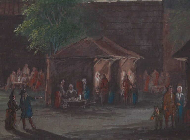 3. Inv. no. KOG-AA-2-22-396; it is probably this version which was sold at the auction of Sybrand Feitama, Amsterdam (Bernardus de Bosch), 16 October 1758, Album G, no. 53 ‘Een kermis op de Botermarkt te Amsterdam: zynde een Nachtlicht; met Oostind. Inkt, h. 5 ¾, br. 8 ¾ d.’ (9 Dfl to Kok together with the next lot).