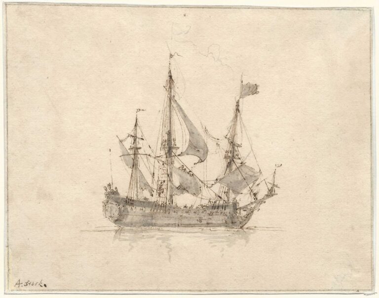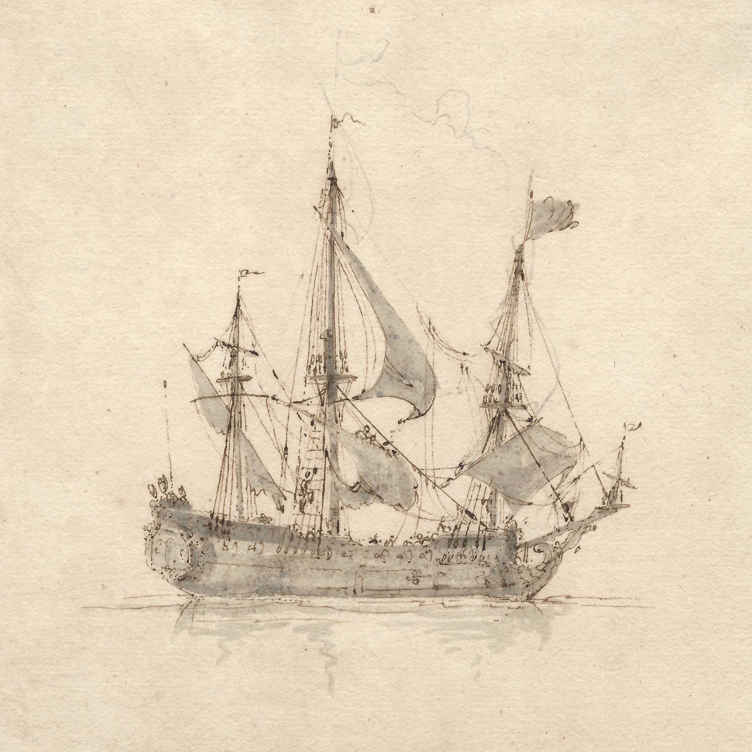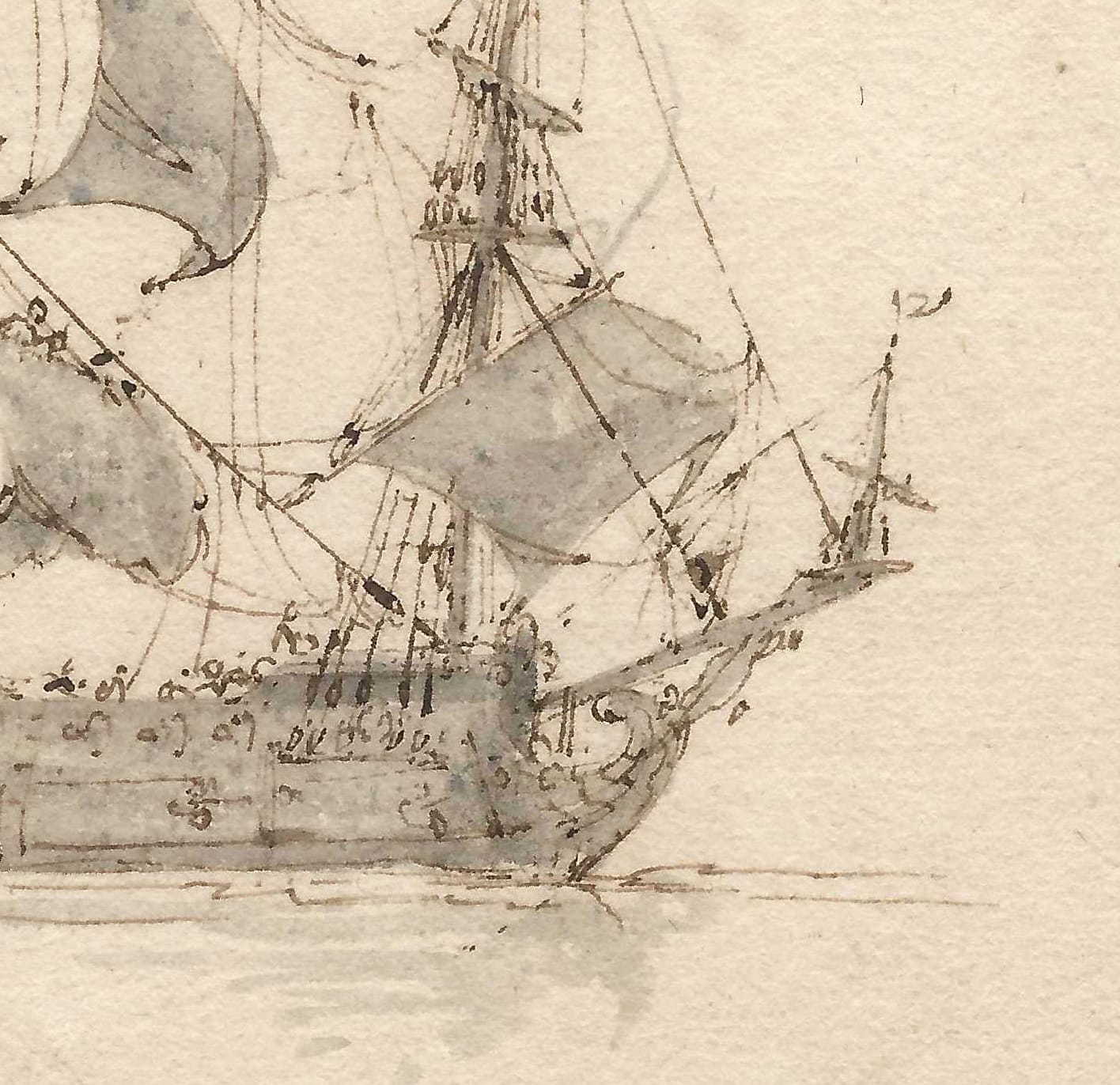 A corpus of several dozens of drawings is known by Storck. Many, like the present charming sheet, can be considered as studies drawn from life, to serve as source material for one of the artist’s marine paintings. Others are more finished in nature and were likely made for contemporary collectors, which are frequently signed and dated. It has rightly been observed by Peter Schatborn that our drawing is rather exceptional in having so much free ‘space’ around the actual drawing. Although possibly not intended by the draughtsman, this conveys a successful atmosphere of spaceousness, as if one would suddenly see this man-of-war coming out of a low-hanging cloud on a misty day.