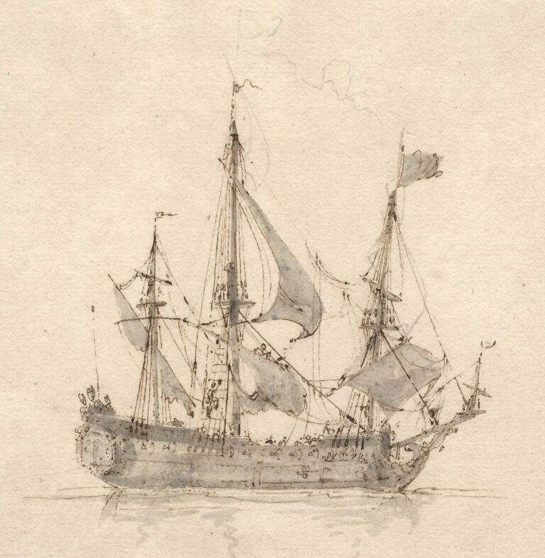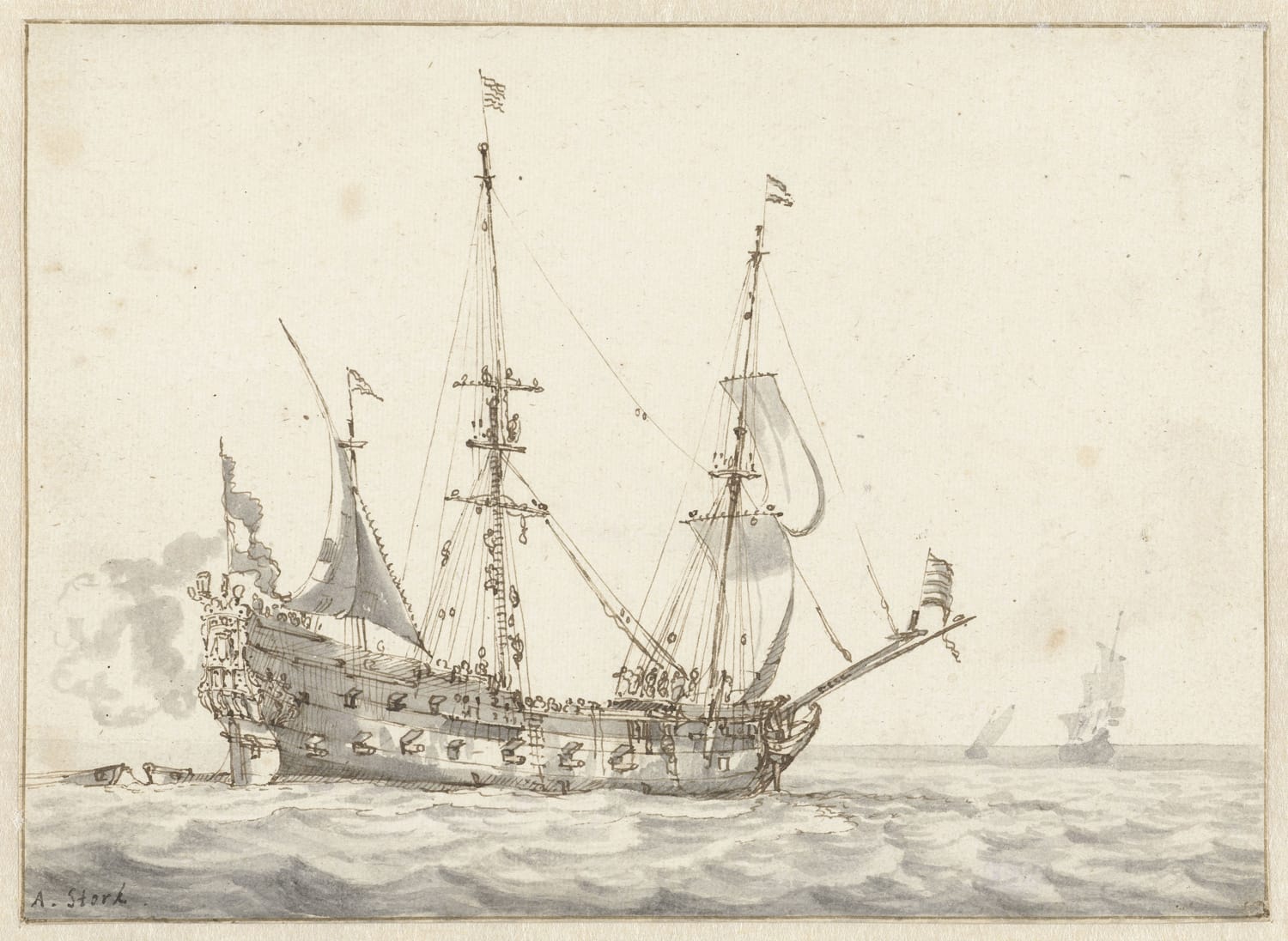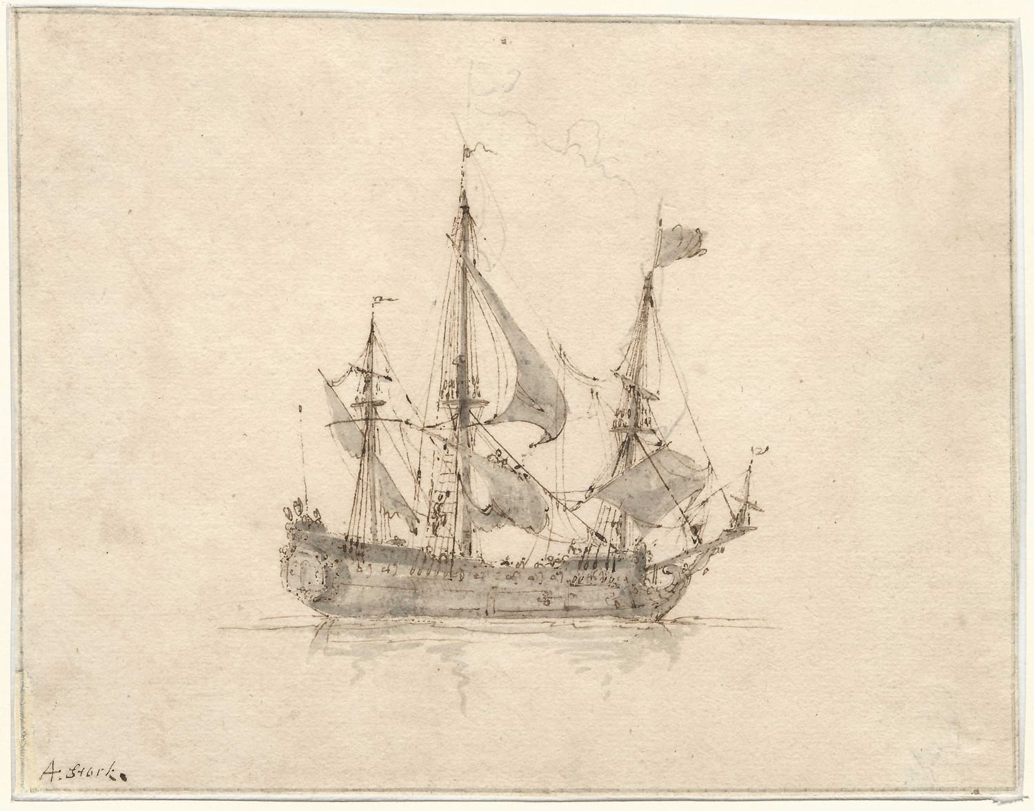 3. Pen and brown ink, grey wash, 125 x 173 mm; inv. no. RP-T-1902-A-4590. The Rijksprentenkabinet also owns a drawing of the English man-of-war The Royal Charles, drawn by Storck in 1672 after it had been captured by the Dutch, inv. no. RP-T-00-256.