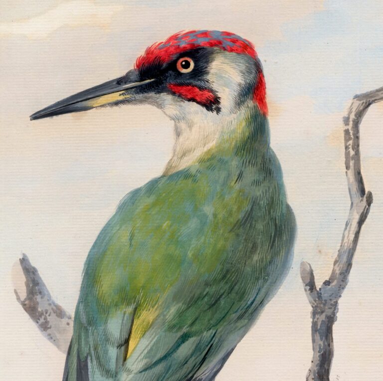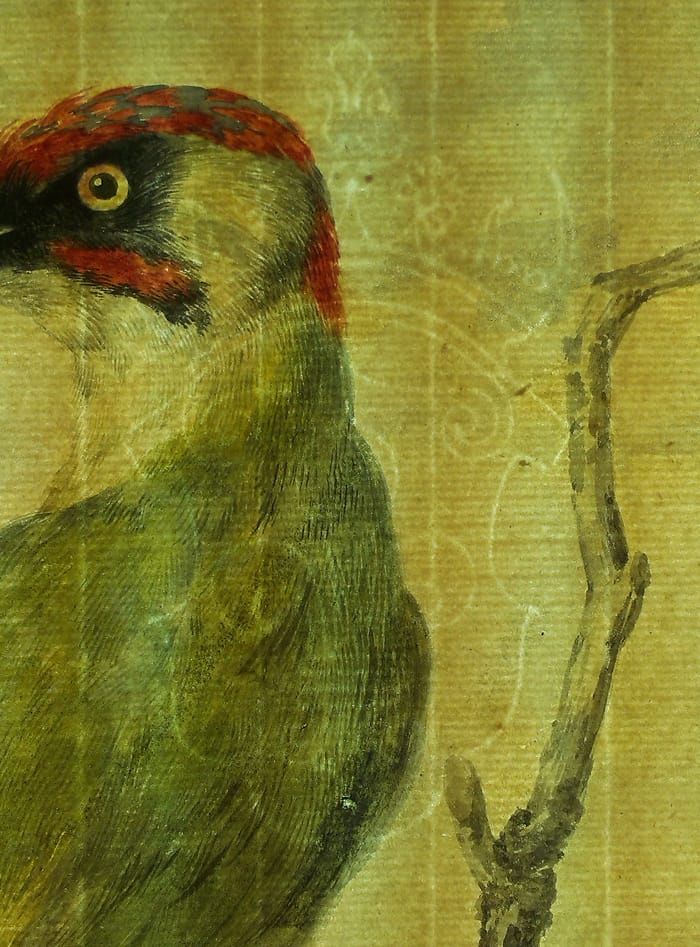 Aert Schouman was an exceptionally accomplished watercolourist. He set these particular birds down on paper without any preliminary drawing. With rapid and transparent brushstrokes, he expertly captured the shine and subtle colours of the birds’ feathers, and the execution of the woodpecker’s eye with its strong, almost modern, use of red, yellow and black washes is masterly. To have achieved such faithful likenesses of birds, he must have studied his models at length, enabling him to capture their very essence. Indeed, they look as if they might flly away at any moment. Schouman favoured birds with distinctive or exotic features; our sheet can for instance be compared to a watercolour of a white-throated toucan of 1748 in the Rijksmuseum, Amsterdam (fig).4