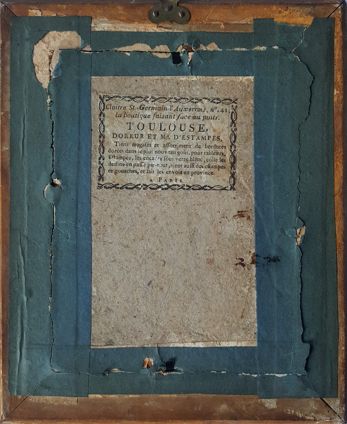 The reverse of the original frame backboard applied with the frame maker’s label: ‘Cloitre St.-Germain-l’Auxerrois, no. 41, la boutique faisant face au puits, TOULOUSE, DOREUR ET Md. D’ESTAMPES, Tient magasin et assortiment de bordures dorées dans le plus nouveau goût, pour tableaux, Estampes, les enadre sous verre blanc, colle les dessins en passe-partout, tient aussi des estampes et gouaches, et fait les envois en provence. A PARIS.’