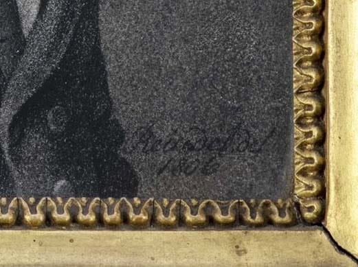 The drawing is still contained in its original Empire frame, including the original backboard and what appears to be the original glass. The backboard is applied with the printed trade label of the frame maker: Monsieur Toulouse, gilder and print dealer based in the Cloitre St-Germain-l’Auxerrois in Paris, now part of the Place du Louvre. Little is known about Mr Toulouse, but he is listed in a trade almanac of the period.2 To have a drawing of this quality from this period still contained in its original frame is rather rare.