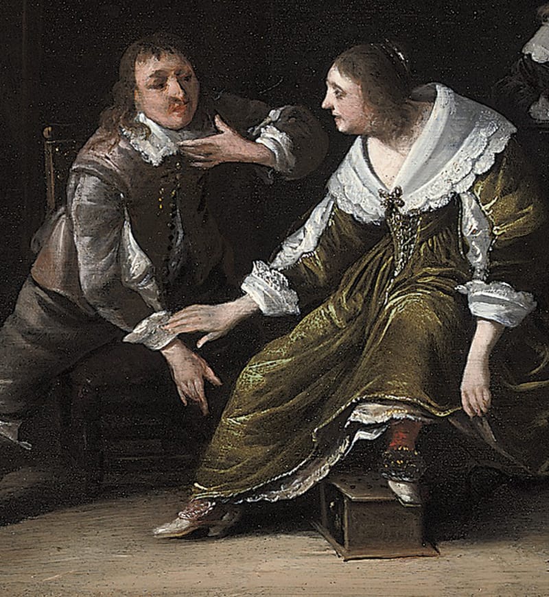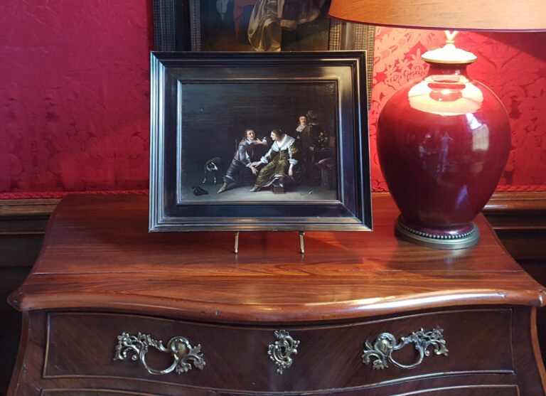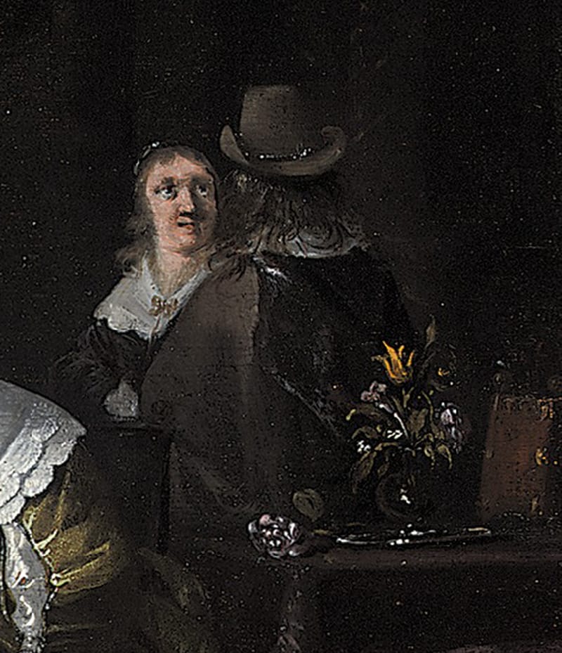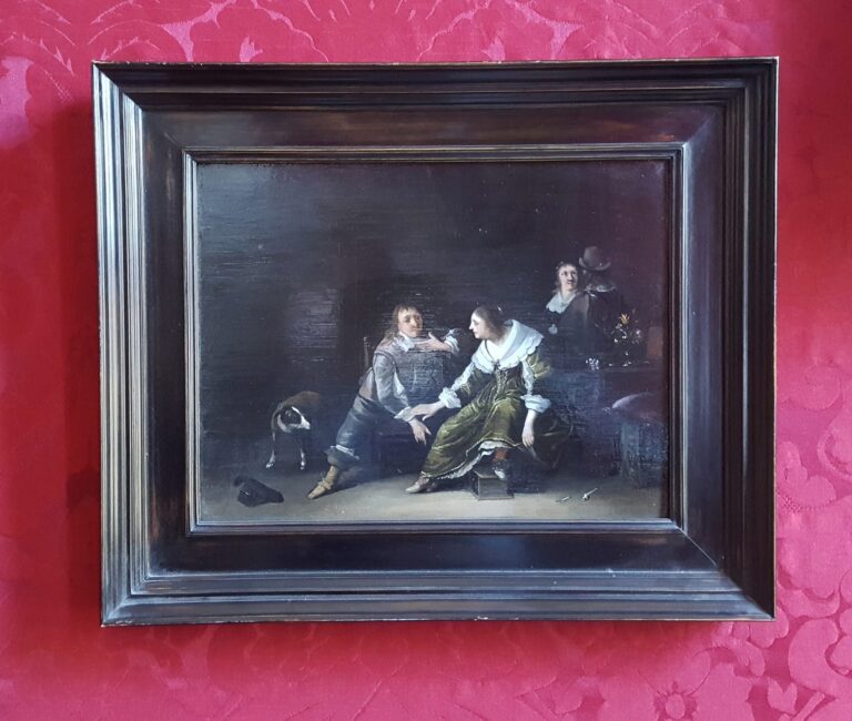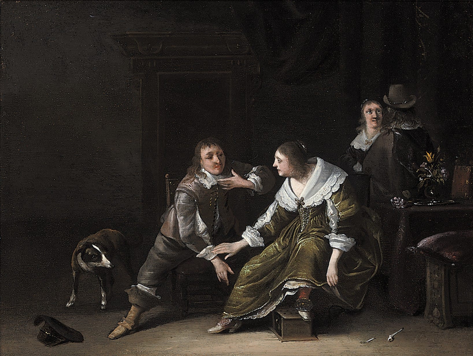 In this amusing work we see an apparently elegant scene of several richly clothed figures in an interior. Any person living during the 17th century would have immediately recognized this as a brothel scene, with a potential client attempting to lift up the dress of the seated young woman, but is turned down by her, presumably as they had not reached an appropriate financial agreement yet. Such scenes would have caused enormous hilarity during the Golden Age and were collected by patrons from the highest circles. A fascinating detail is the vase of tulips on the table: this suggests the picture might have been painted around 1635-1640, when the whole of Holland was gripped by ‘Tulipmania’.