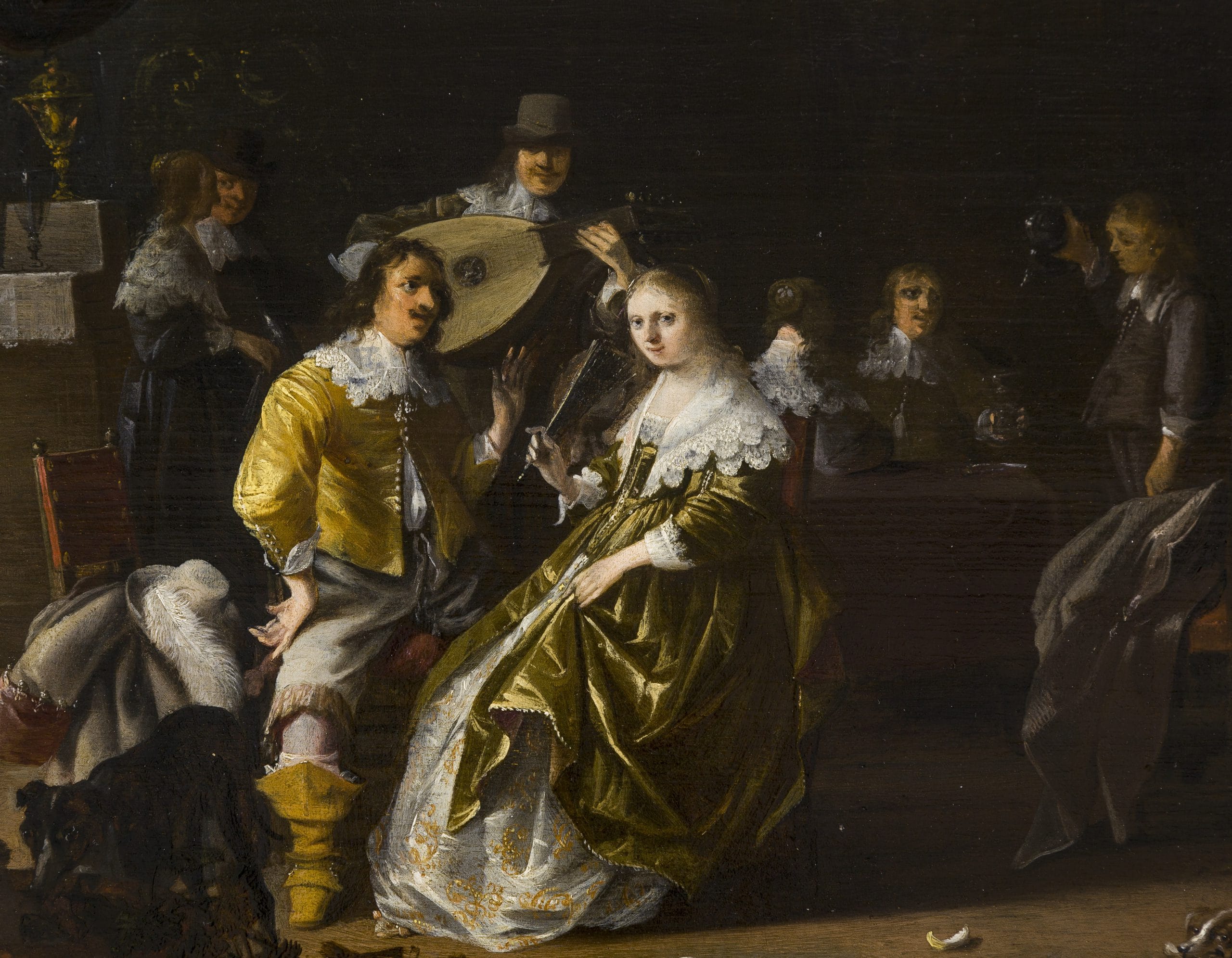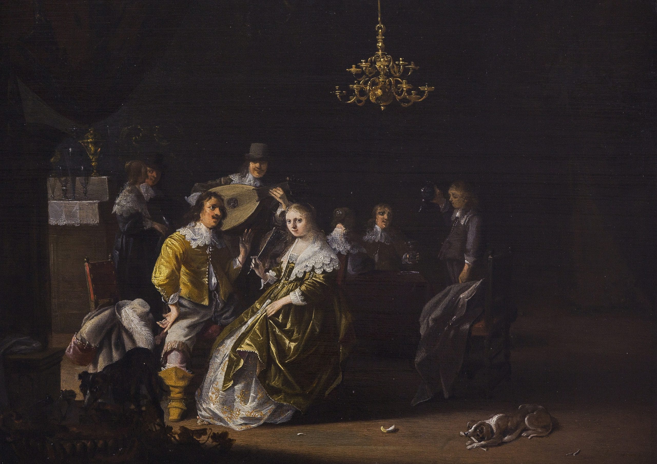 In this beautiful work we see an elegant scene of several richly clothed figures in an interior. A buffet with sumptuous glass and metalware is set out in the background, while the figures around the table are amusing themselves with song, music and wine. The painting is filled with detail, and the brass chandelier and wine cooler in the foreground are beautifully observed, as are the elegant costumes of the figures. Based on the costumes the painting can be dated around the year 1640.