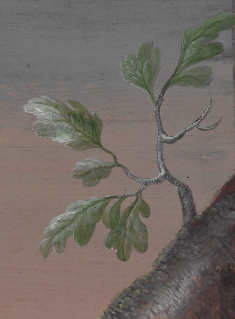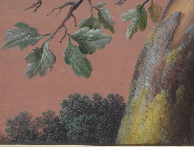 Dietzsch specialised in natural history subjects, carefully portrayed in watercolour and gouache. She primarily painted flowers, but also birds, plants and shells. Some of her works have monochrome backgrounds, whilst others, such as the present sheet, are set against landscape settings, generally bathing in a warm light. These subjects taken from the natural world reflect the growing academic interest of the Enlightenment of the eighteenth century, which can also for instance be seen in the emergence of encyclopedias, most notably that compiled by Denis Diderot and Jean le Rond d’Alembert, which was published in Paris from 1751 to 1766.
