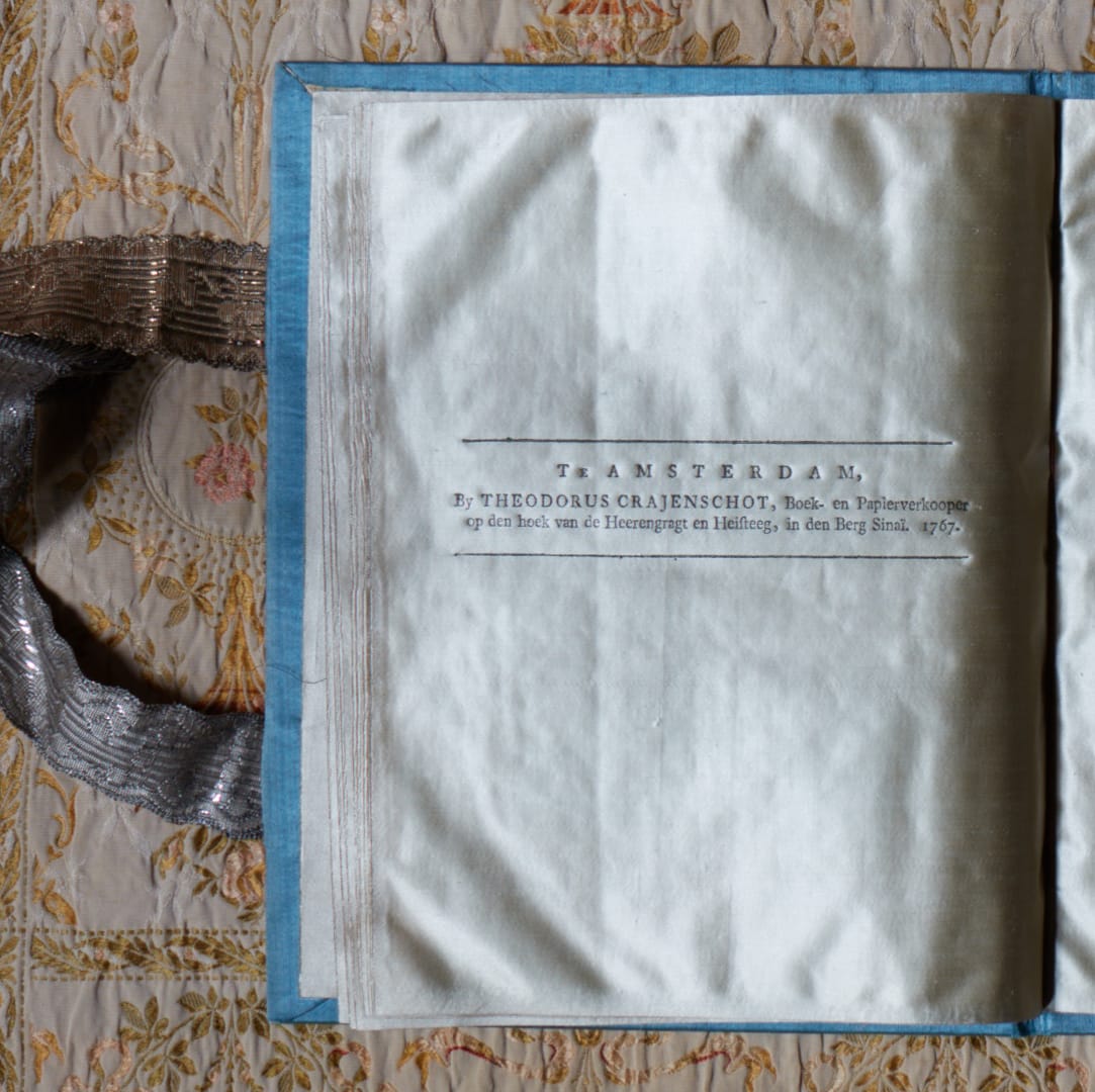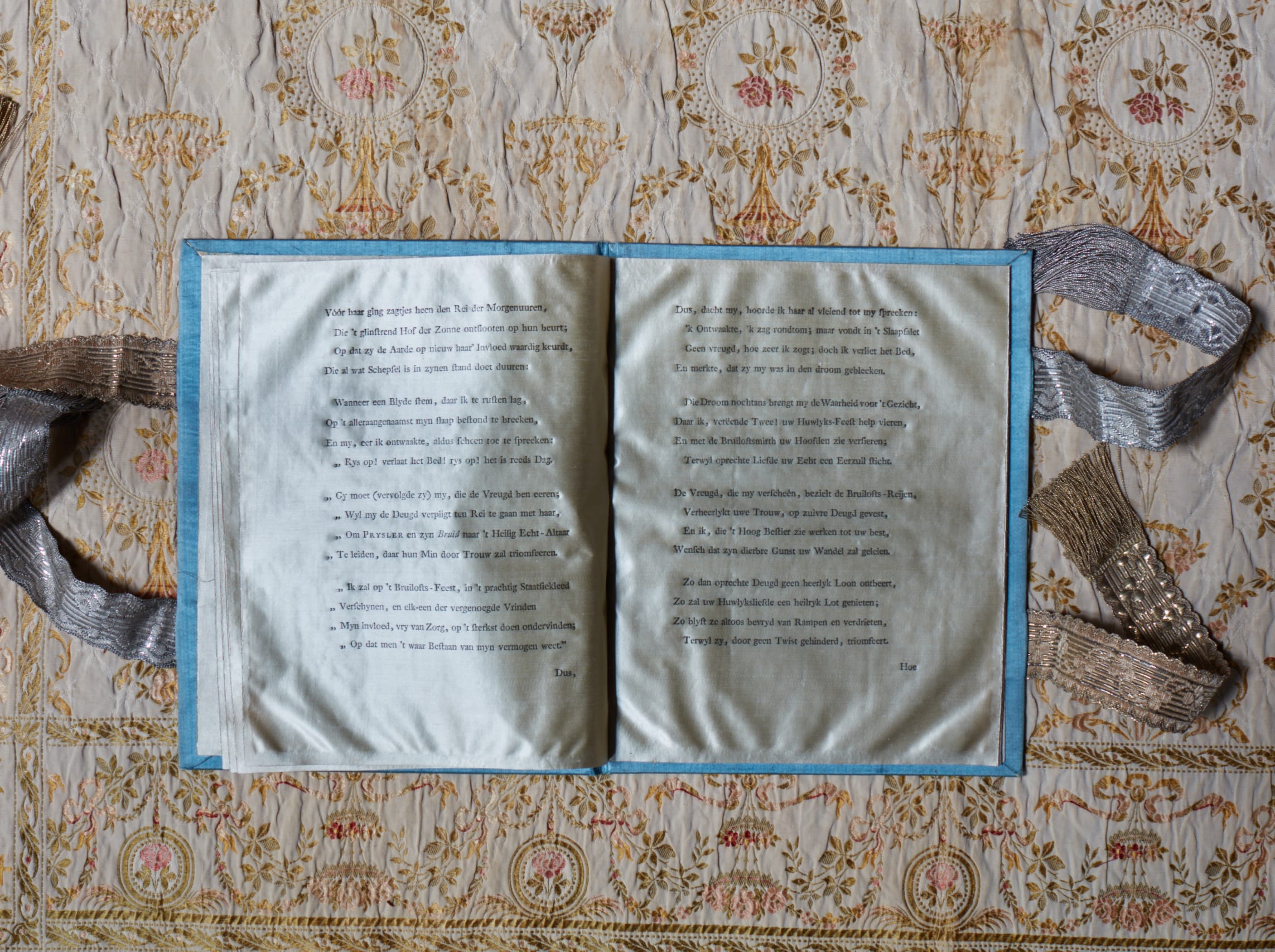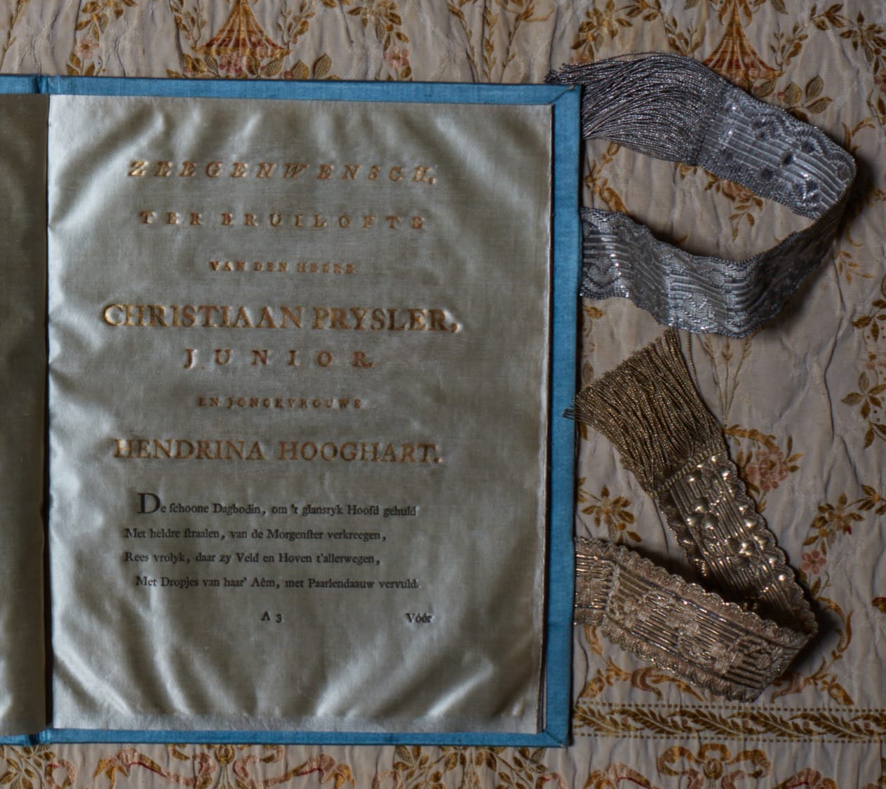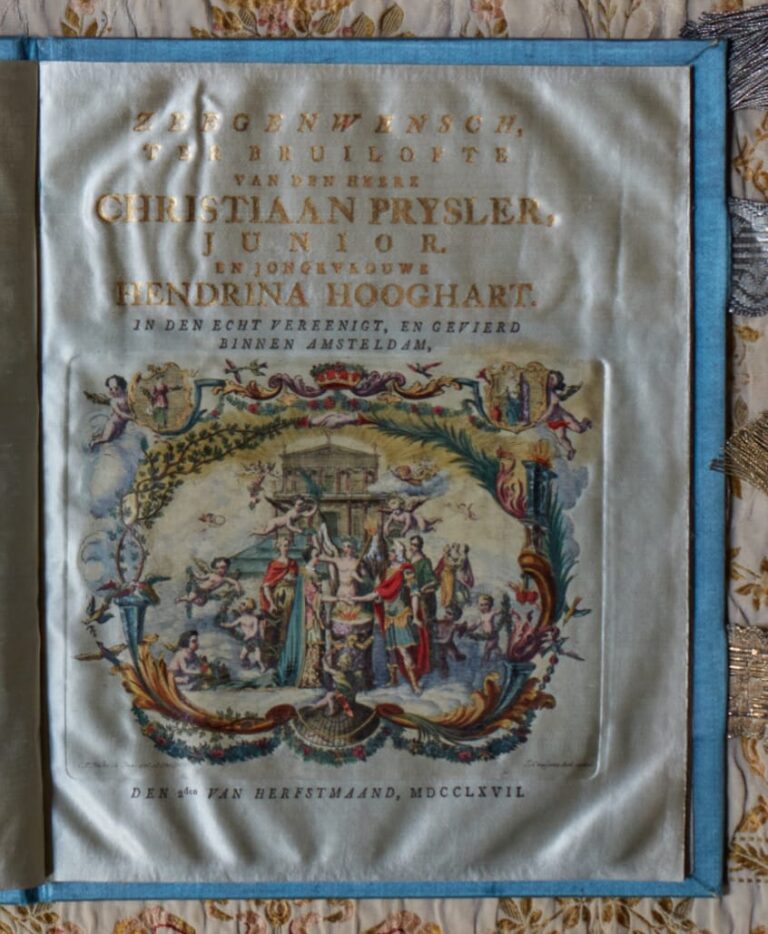 Zeegewensch ter bruilofte van den heere Christiaan Prysler Junior en jongkvrouwe Hendrina Hooghart. In den echt vereenigt, en gevierd binnen Amsteldam, den 2den van Herfstmaand, MDCCLXVII, printed and published by Theodorus Crajenschot, Amsterdam, 1767, printed in black ink and gold leaf on silk pages, and heightened in watercolour; in the original blue satin binding by Jacobus Cornelis Schoots van Cappelle, stamped in gold ‘C.P. / H.H. / 1767’ and with silver and gold thread ribbons; contained in the original red morocco case, stamped in gold ‘Twee / An / Een’, en ‘Gebonden / 1767 / den 2. September’.