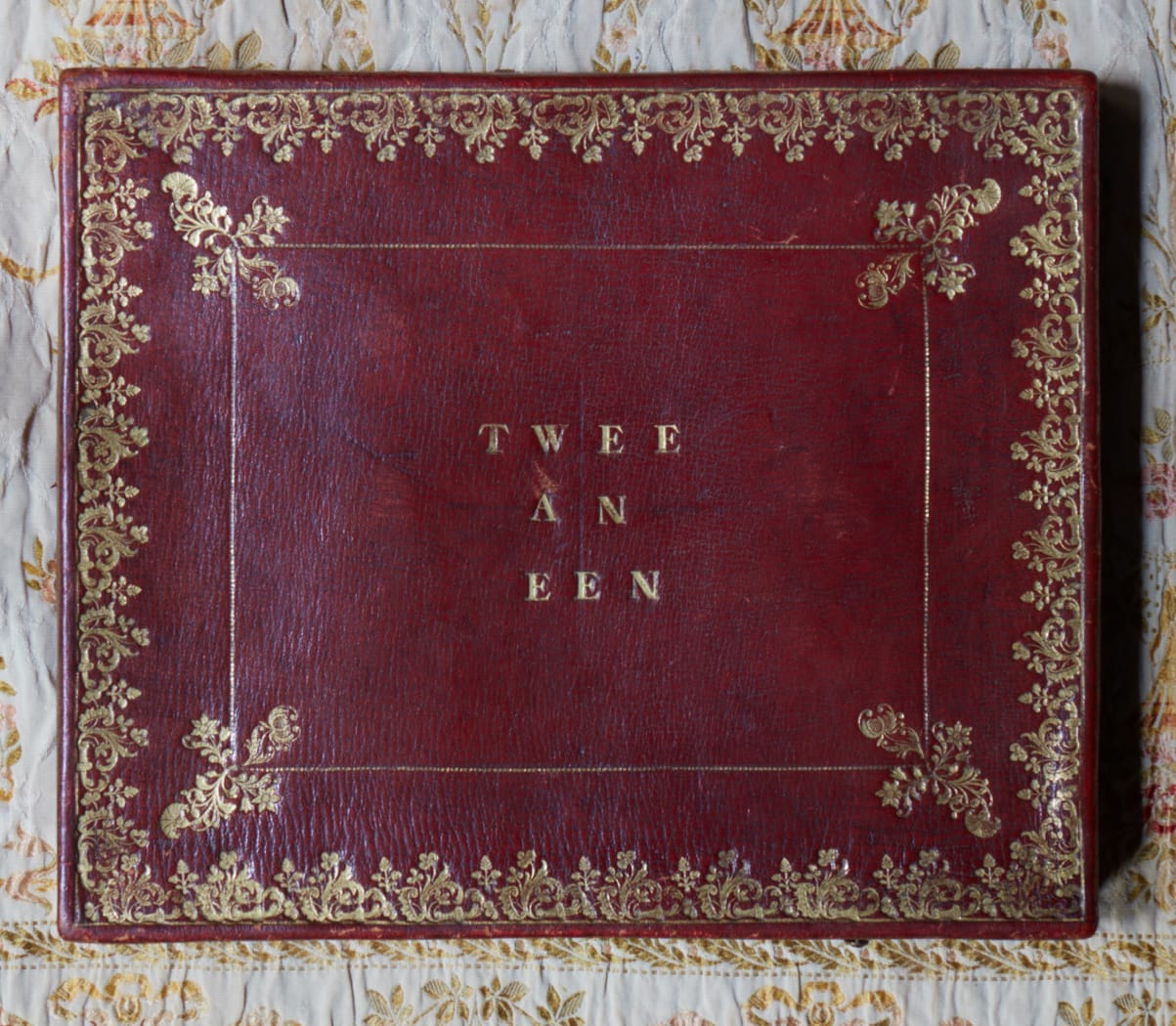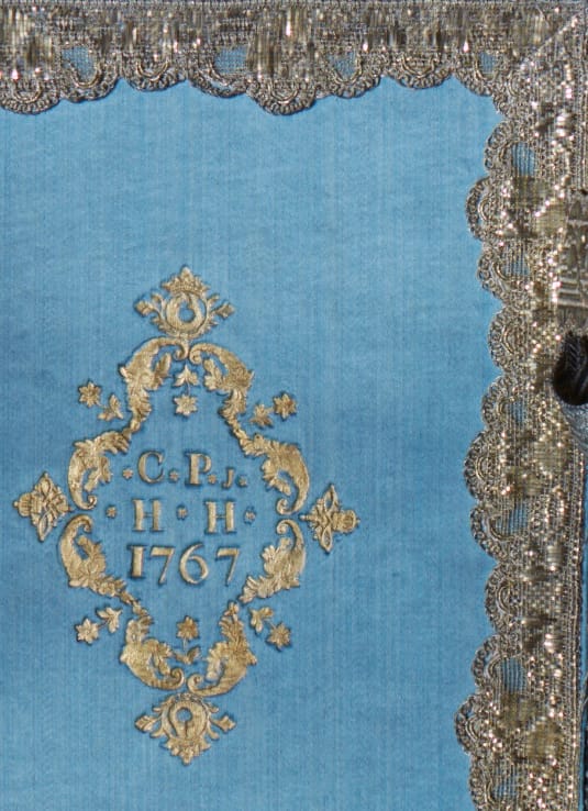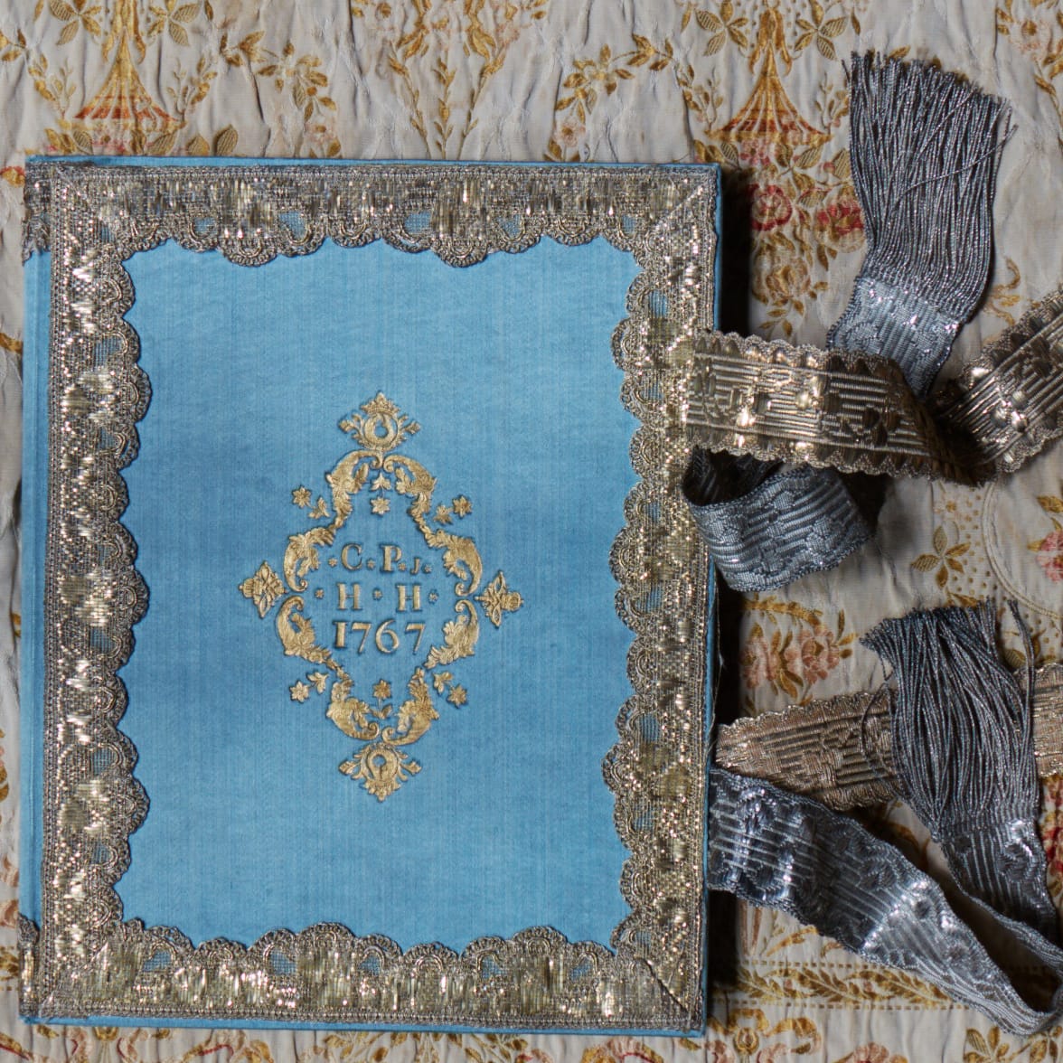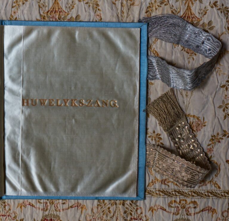 Zeegewensch ter bruilofte van den heere Christiaan Prysler Junior en jongkvrouwe Hendrina Hooghart. In den echt vereenigt, en gevierd binnen Amsteldam, den 2den van Herfstmaand, MDCCLXVII, printed and published by Theodorus Crajenschot, Amsterdam, 1767, printed in black ink and gold leaf on silk pages, and heightened in watercolour; in the original blue satin binding by Jacobus Cornelis Schoots van Cappelle, stamped in gold ‘C.P. / H.H. / 1767’ and with silver and gold thread ribbons; contained in the original red morocco case, stamped in gold ‘Twee / An / Een’, en ‘Gebonden / 1767 / den 2. September’.
