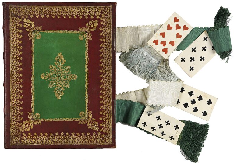 The book celebrates the union of Christaan Prysler junior and Hendrina Hooghart, which took place on 2 September 1767. The collections of the Koninklijke Bibliotheek in The Hague include an unsually lavishly produced wedding poem of 1757, produced on the occasion of the wedding of Jacobus Franciscus Hooft van Huysduynen and Alida Hooghart, who was the sister of the bride of our poem (fig.). This example is bound in red morocco and inset with green-coloured vellum, stamped in gold and decorated with highly unsually ribbons incorporating playing cards. Both sisters were children of the merchant Arnold Hooghart, who was involved in the lucrative whale trade. The groom was a member of a family of glass producers and dealers, who were of Bohemian descent. Like the printer, Crajenschot, both Prysler and Hooghart families were Catholic.