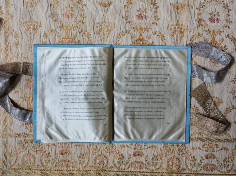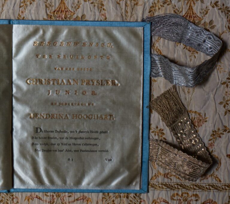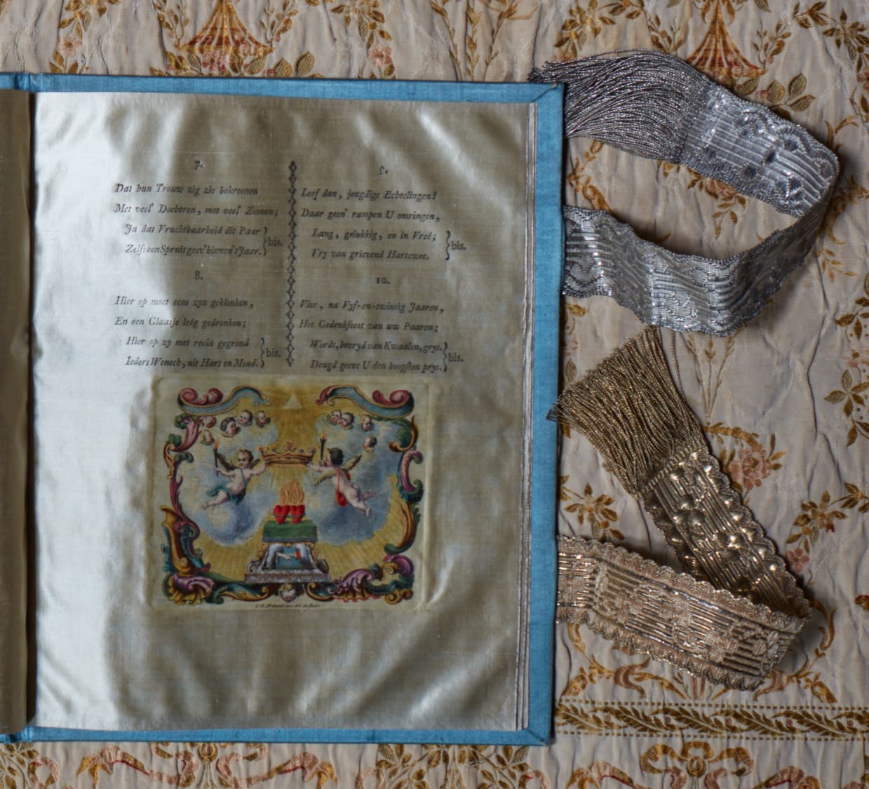 There was a vivid tradition in The Netherlands during the seventeenth and eighteenth centuries to produce elaborate wedding poems, extolling the virtues of the groom and bride. These were generally printed on paper and read and distributed to wedding guests. In some rare examples these were also printed on silk, it is thought only for the wedded couple itself. During the seventeenth century, these ‘gelegenheidsgedichten’ were usually only one page long, while they became increasingly more elaborate during the eighteenth century, and sometimes evolved into small booklets. There are 6660 such poems dating before 1800 preserved in the five largest Dutch collections. The overwhelming majority is printed on paper, only seven examples are printed on silk, which illustrates their rarity.1 The earliest known wedding poem on silk, dating to 1674, was sold by ourselves in 2021 to the Koninklijke Bibliotheek in The Hague, and the second-oldest, dating to 1675, was acquired in 2002 by the Rijksmuseum in Amsterdam.2