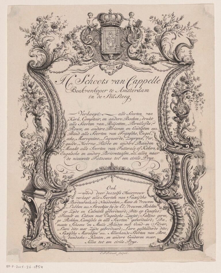 Jacobus Cornelis Schoots van Cappelle is considered the most important book binder active in eighteenth-century Holland.3 A beautifully produced and fascinating advertising sheet survives in the Rijksprentenkabinet, listing the wares that Schoots could produce.4 The sheet also lists the activities of Schoots’s ‘Huisvrouw’, who dealt in embroidery, silks, satins, ribbons and passementerie. In the year of production, Schoots van Cappelle was listed as a ‘boekverkooper in de Beursstraat, by den Dam’.5