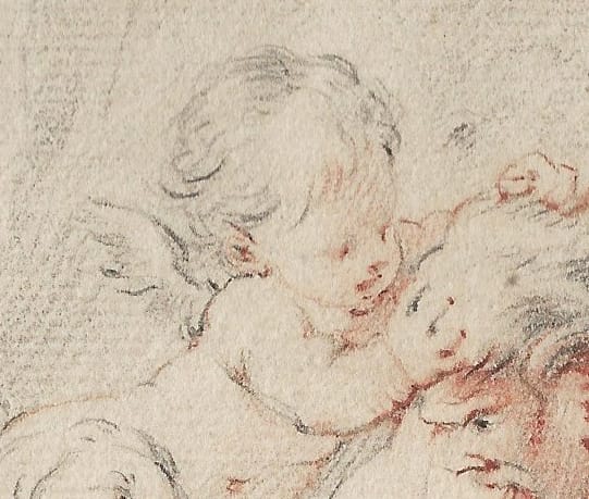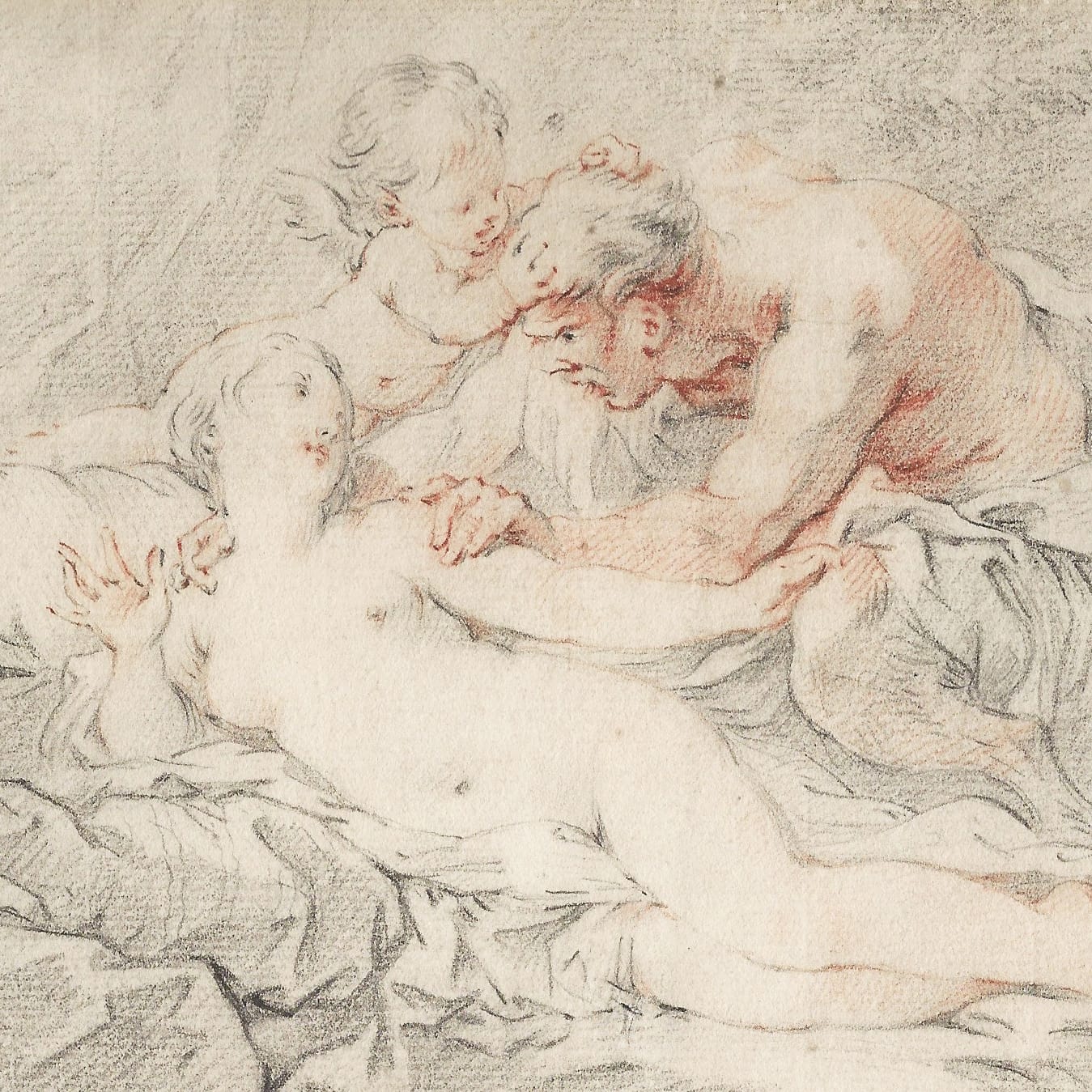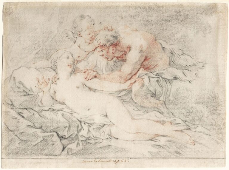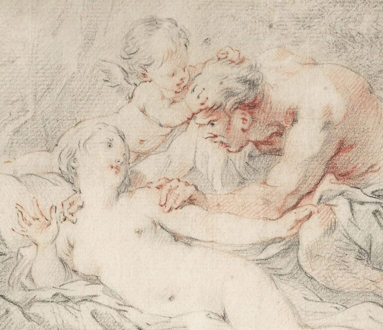 Our drawing is particularly luscious and reveals the overwhelming influence of François Boucher (1703–1770), also much patronised by Mme de Pompadour. In the present drawing, Venus is besieged by an adamant Satyr, who is being resisted by Cupid. In 1766 Eisen was at the height of his career, which coincided with the culmination of French Rococo art, only a decade or so before its eventual decline under Louis XVI, who ruled from 1774 and favoured a more restrained and Classical style.