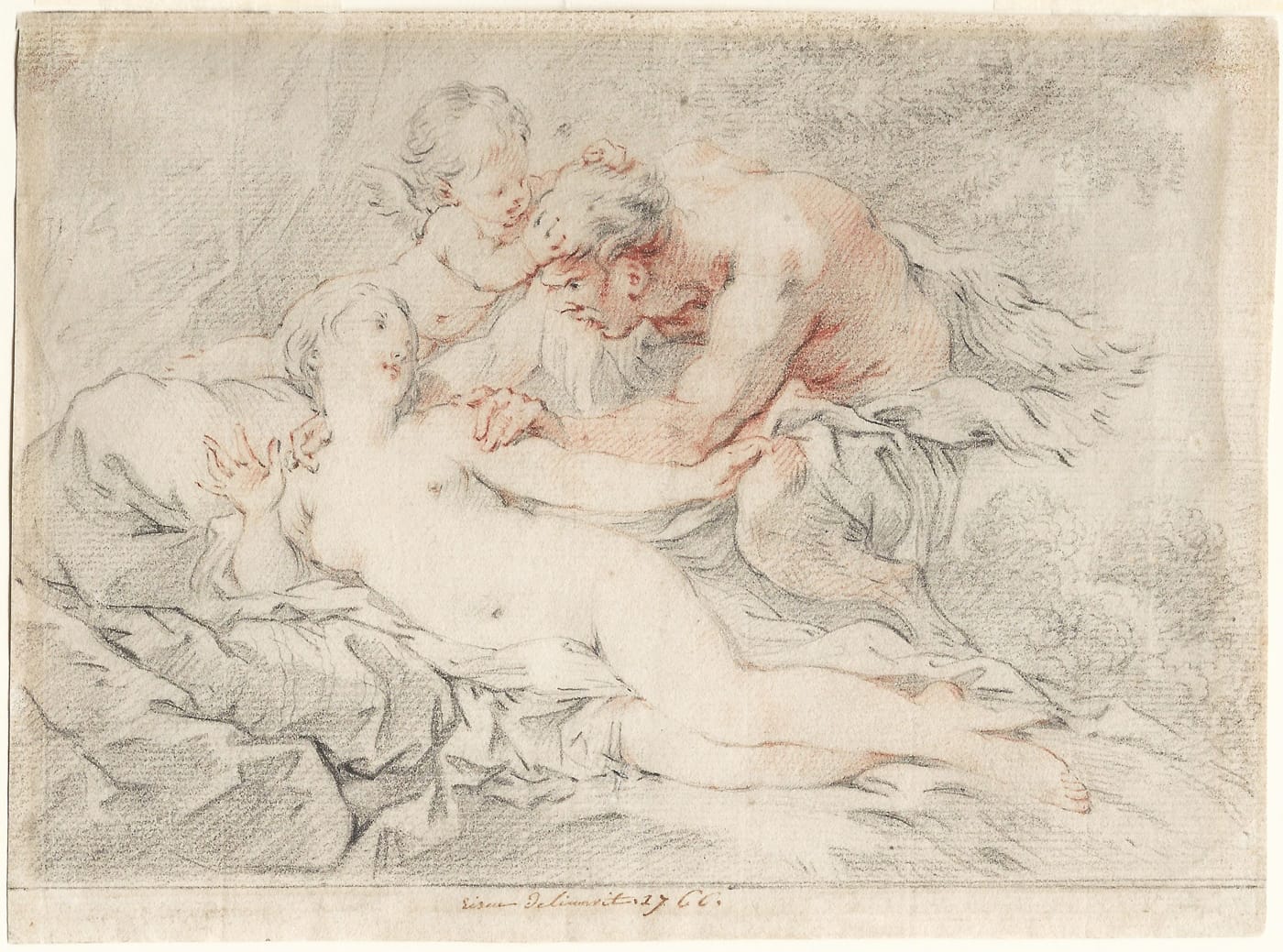 A large group of drawings and vignettes by Eisen is preserved in de Musée Condé in Chantilly, and our sheet can for instance be compared to Eisen’s Venus Surrounded by Cupid and Nymphs of 1772 in that collection (fig.).2 Eisen’s use of ‘delineavit’ rather than ‘invenit’ in the present work might suggest it was not intended to be engraved, but was executed as a work of art in its own right, intended to be framed and displayed, which is also suggested by the painterly use of both black and red chalk.