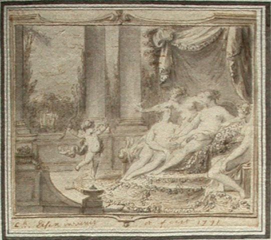 2. Black chalk, grey wash, signed and dated ‘Ch. Eisen invenit et fecit 1772’, inv. no. IX-G-41-22; the drawing is one of 28 sheets in preparation for the Vie d’Anacréon, Sapho, Bion et Moschus, Héro et Léandre, published by Lamy in Paris in 1782