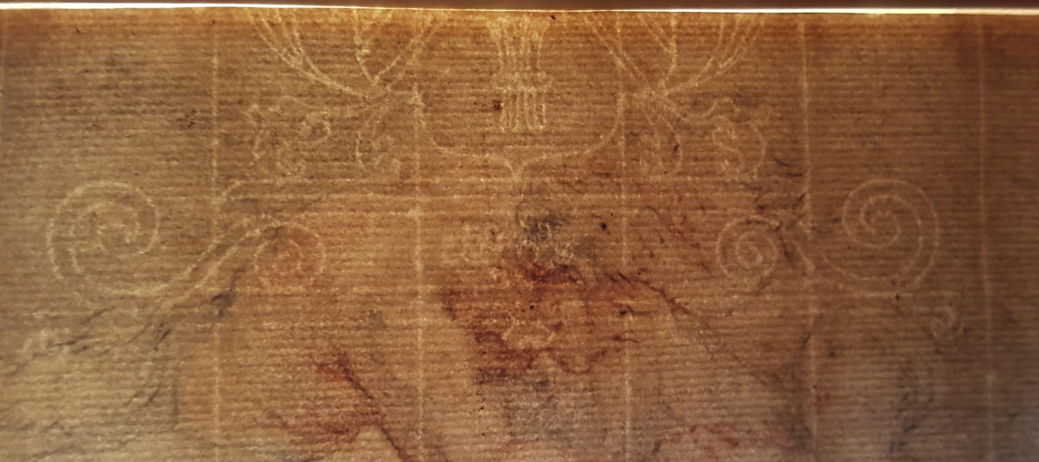 Black and red chalk, black chalk framing lines, fragmentary watermark coat of arms, 135 x 181 mm (5.3 x 7.1 inch)