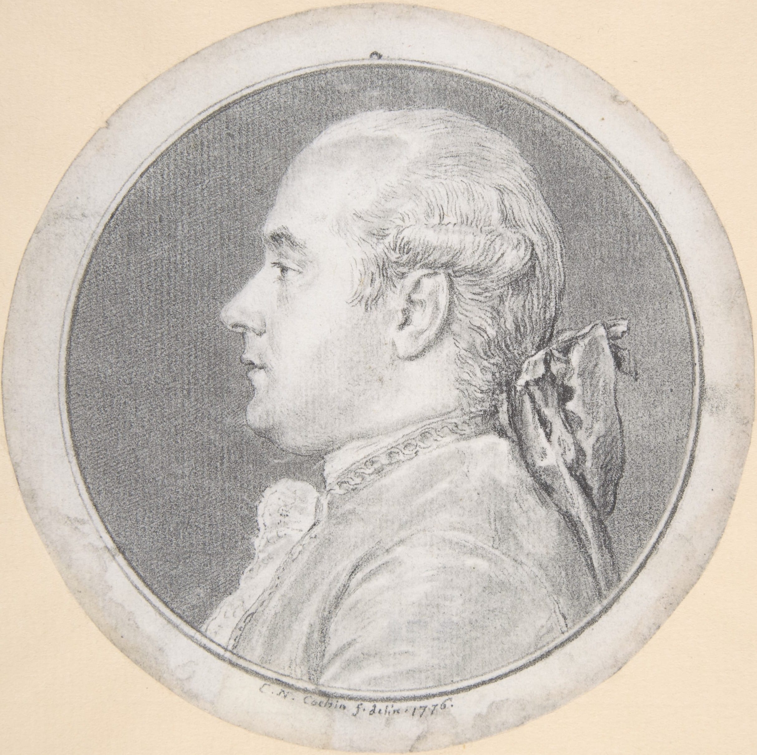 4. Signed and dated 1776 in his usual form, also seen in our drawing; graphite, diam. 115 mm, inv. no. 1970.41.2; Jacob Bean and Lawrence Turčić, 15th-18th Century French Drawings in The Metropolitan Museum of Art, New York, 1986, cat. no. 72, p. 71, ill.