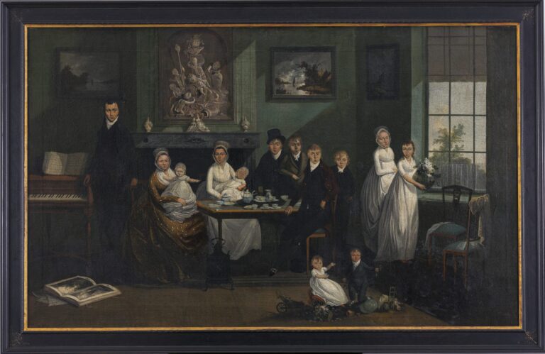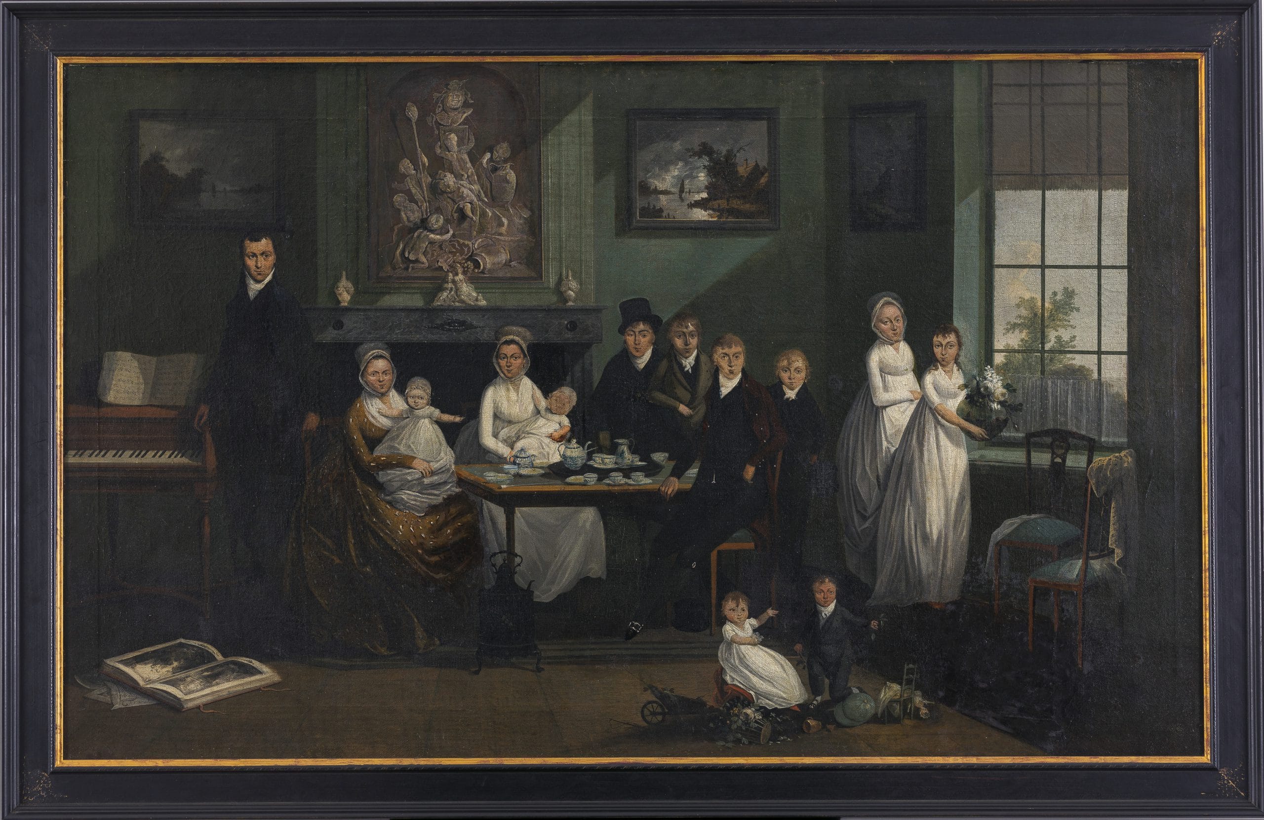 The present portrait is among Franck’s most accomplished portraits. An extensive group has assembled in an elegant interior, engaged in a variety of pursuits. Although the identity of the sitters is lost to time, the group appears to consist of two families, either two sisters or two brothers with their respective families. Two mothers sit in front of the fireplace, holding infants; they are flanked by two men, presumably their husbands, while three sons are portrayed by the gentleman in top hat. Two elder daughters in elegant dresses stand by the window, one holding a vase of flowers, and two toddlers are playing in the foreground, surrounded by toys, miniature furniture and flowers. The gentleman at the left stands by a piano, with an open volume on the floor in the foreground – it has been suggested that the book is the illustrated bible by Gerard Hoet, entitled Taferelen der voornaamste geschiedenissen van het Oude en Nieuwe Testament, published in The Hague in 1728.3 The prominent position of this bible may indicate that one of the gentleman in this portrait could have had a religious position. The artist’s signature appears on the drawn or printed papers underneath the volume.