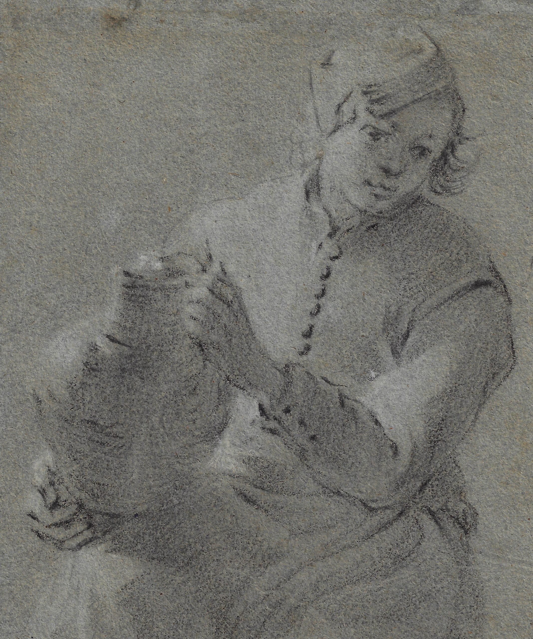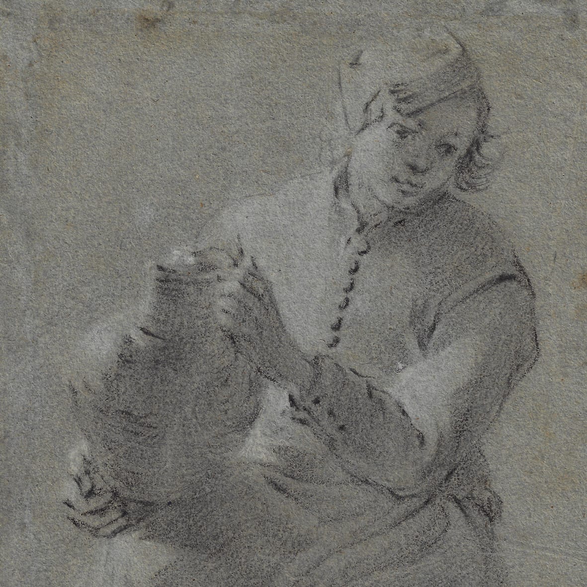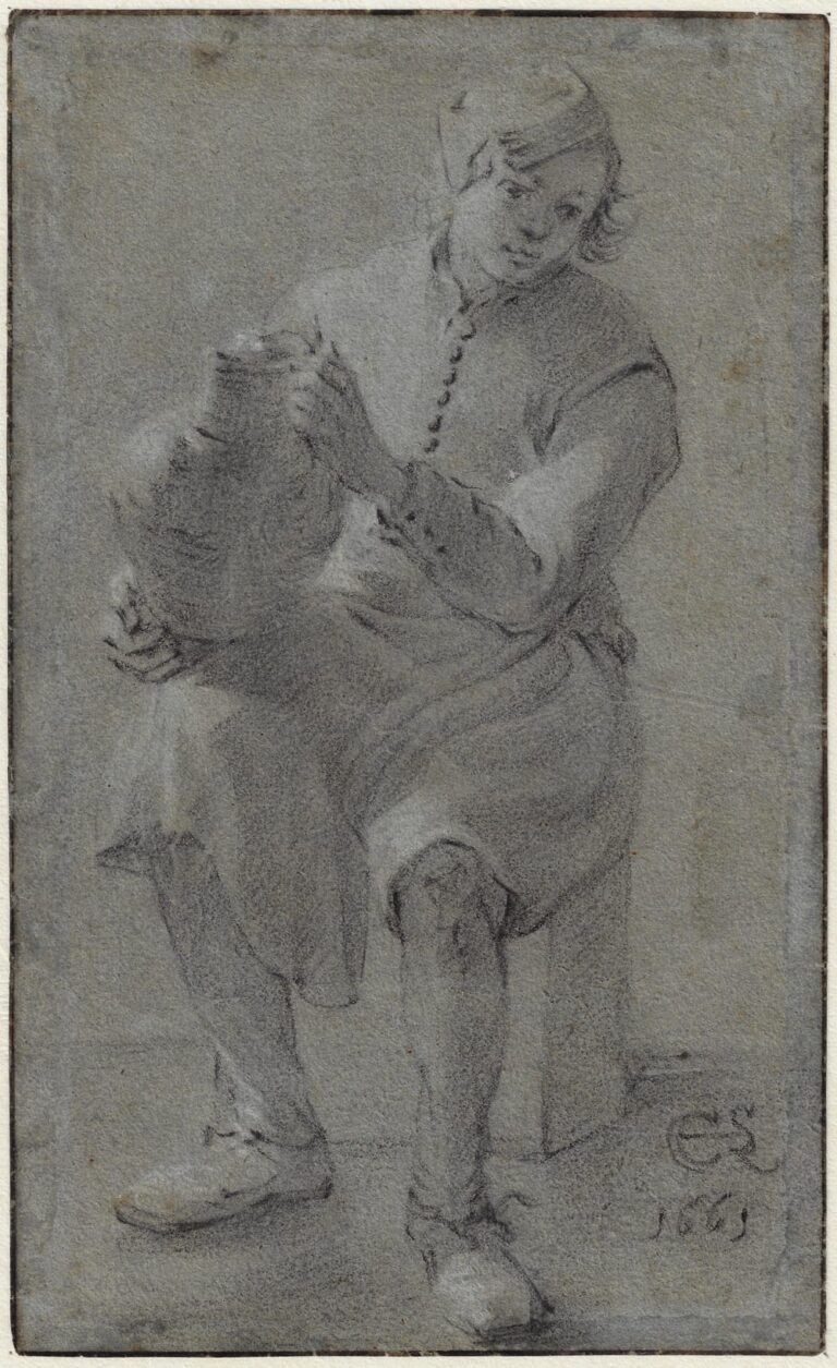 In this well-observed sheet, Saftleven has used a combination of white and red chalk on blue paper, which creates a particularly sculptural effect. Our drawing can for instance be compared to Saftleven’s Seated Man with Pipe in the Rijksmuseum, Amsterdam, which was done in the following year (fig).4