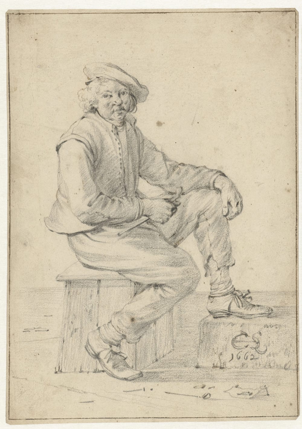 Our drawing can for instance be compared to Saftleven’s Seated Man with Pipe in the Rijksmuseum, Amsterdam, which was done in the same year (fig.).4 Both the Rijksmuseum drawing and our sheet share the characteristic occasional touches of pen and brown ink reinforcing key features of the figure.