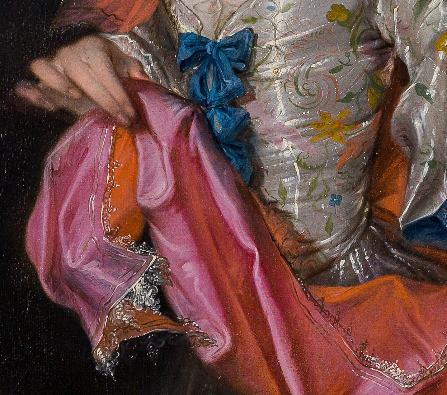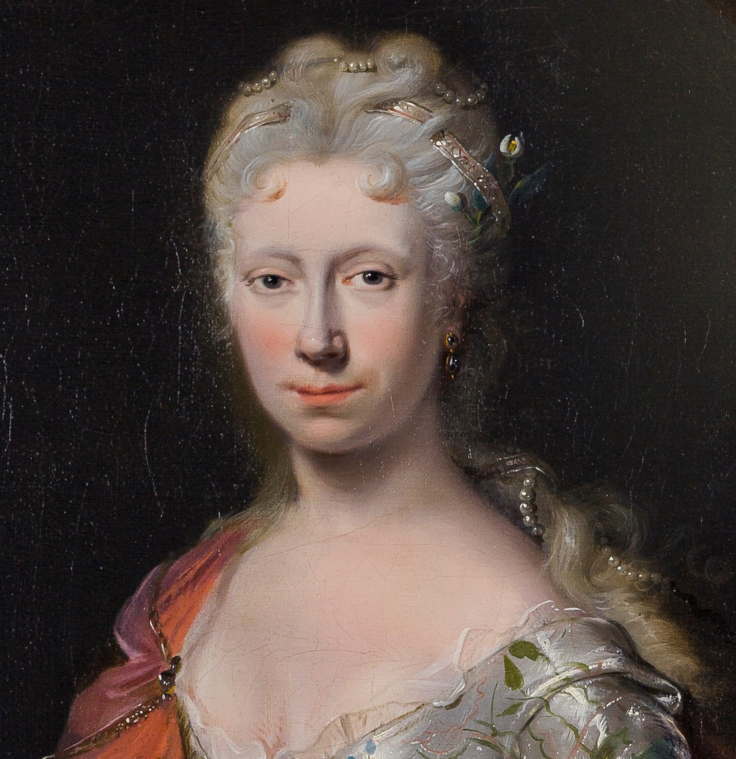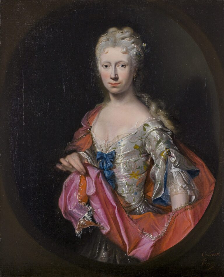 The loose handling of the brush, especially in the embroidered decoration of the lady’s extravagant dress, is particularly noteworthy and more reminiscent of the best painters of the seventeenth century, rather than that of his own times. The present canvas can be compared to a portrait of Maria Magdalena Stavenisse (1700–1783) in the Rijksmuseum in Amsterdam, dated 1726 (fig.).3
