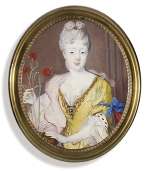 This is one of Le Clerc’s most ambitious works in this medium. Normally he worked at smaller size, such as his refined miniature portrait of Princess Teresa Kunegunde Sobieski (1676–1730) of 1708, daughter of the Polish King John III Sobieski, and wife of Maximilian II Emanuel, Elector of Bavaria (see fig.).4 A nearly identical portrait of the Landgrave was described in an inventory of his possessions in 1730 and is still in Kassel.5 The Kassel replica is dated 1714, two years later than our work, which is likely to have been the prime version.