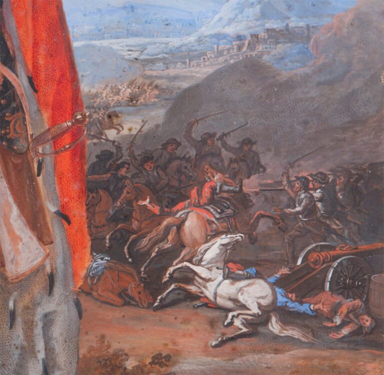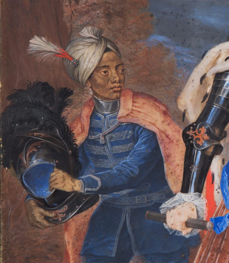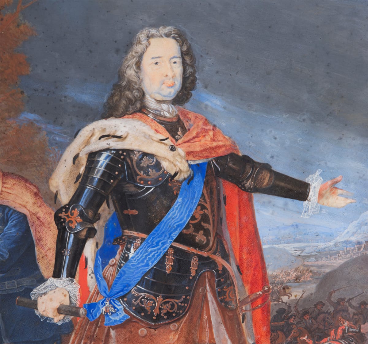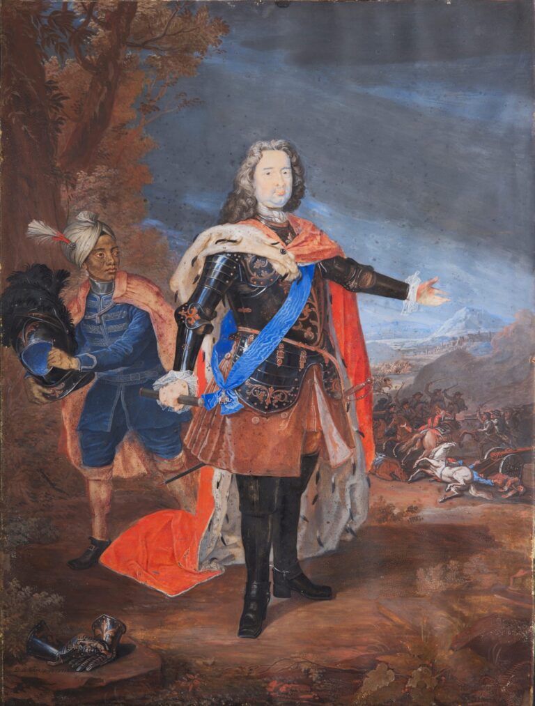 Le Clerc has depicted the Landgrave as a military commander, with a battle raging in the background. He is attended by a Moorish page. Firmly clutching a commander’s baton in his right hand, the Prince is shown wearing elaborately decorated armour and an ermine-lined cloak. From a blue silk sash hangs the Order of the Elephant, the highest order awarded by the Kings of Denmark.