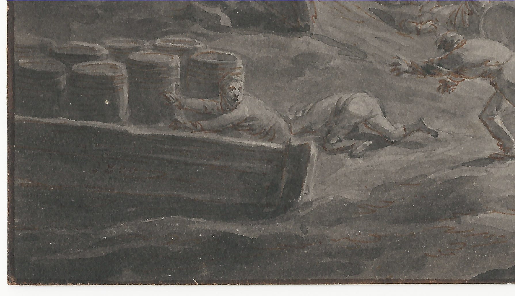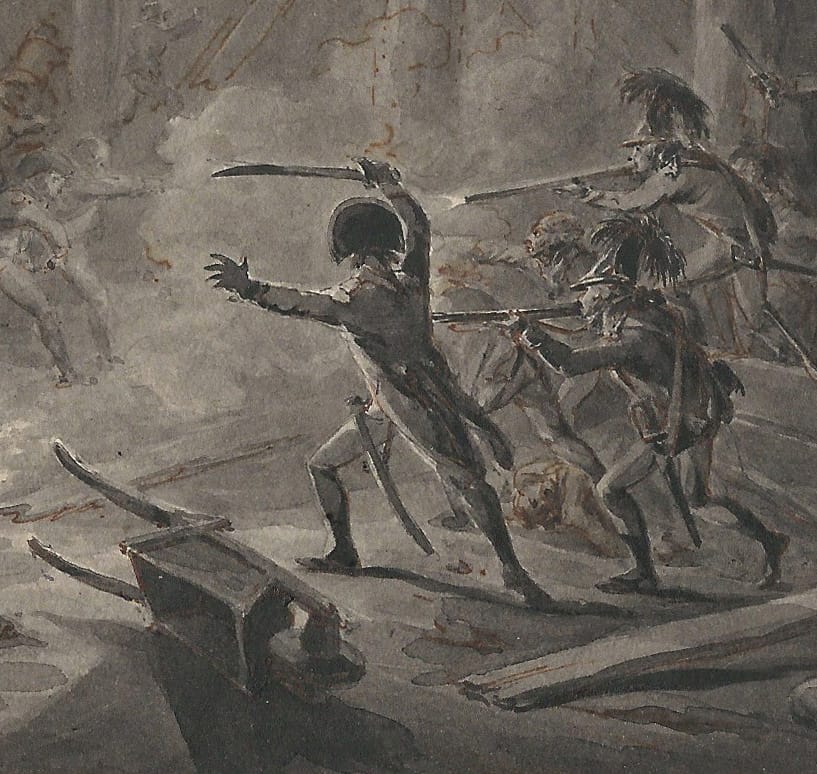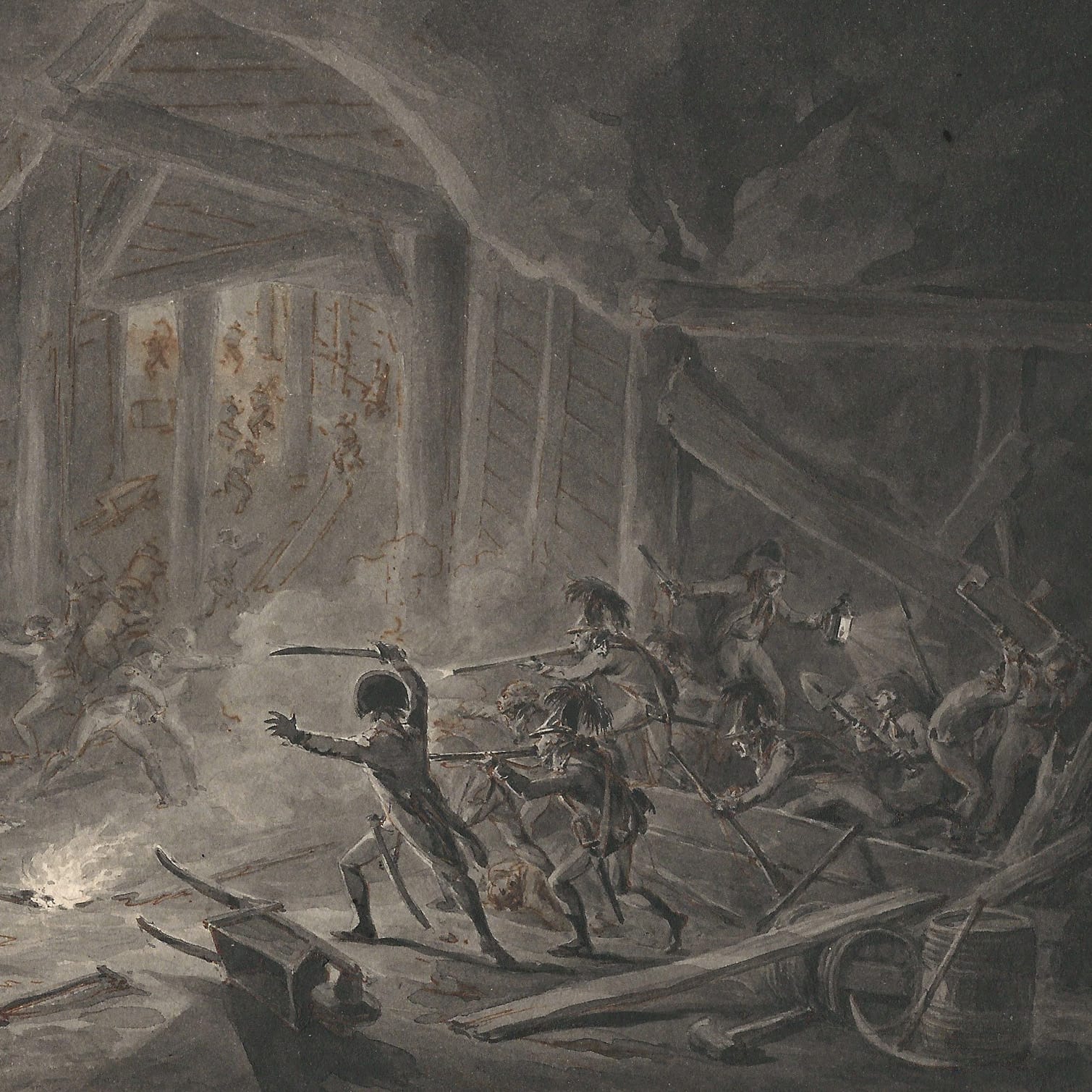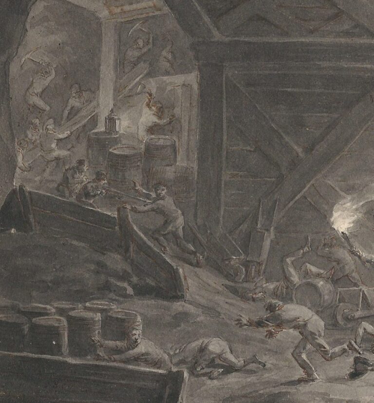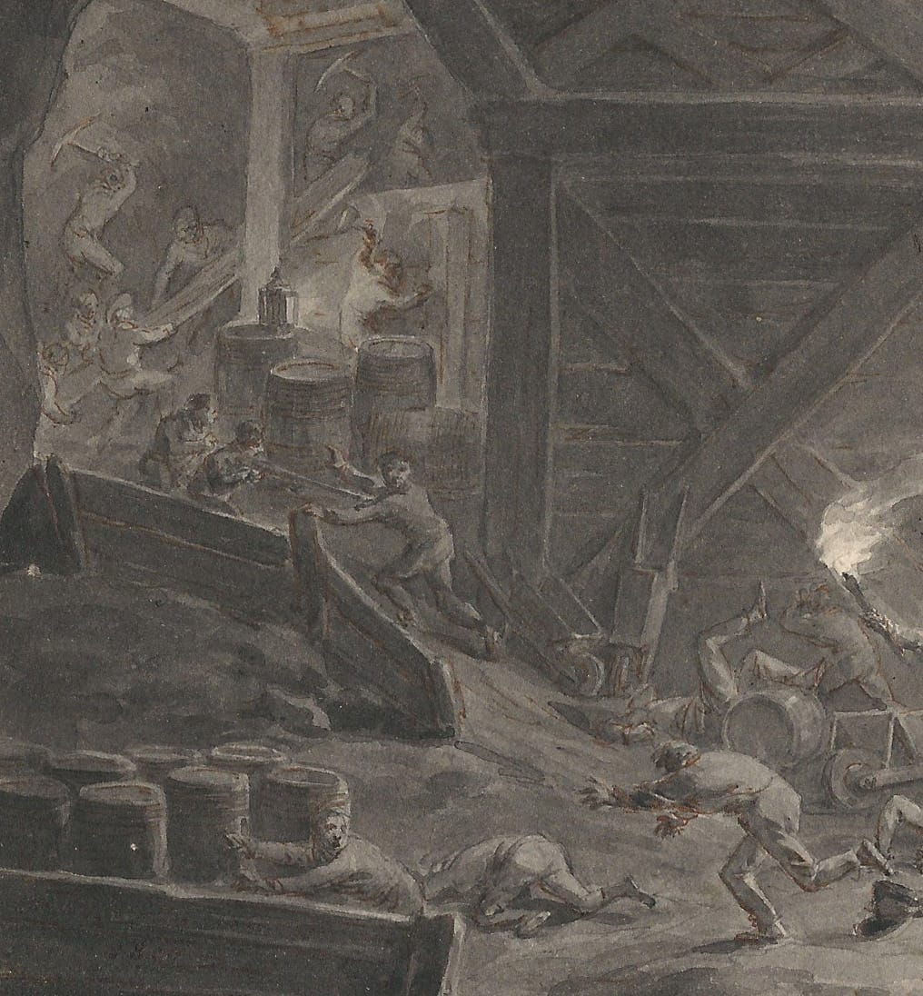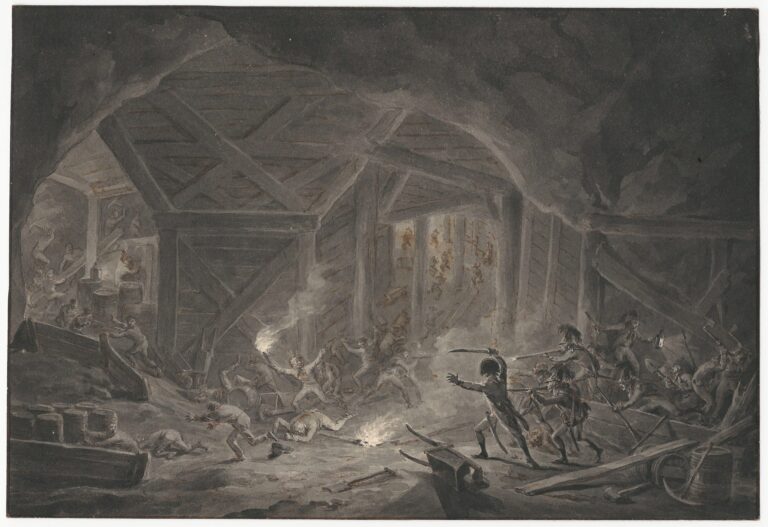 I am very grateful to Dr Louis Sloos of the Nationaal Militair Museum in Soest for identifying this scene in rather mysterious surroundings as a military engagement during the Siege of Maastricht in 1794.2 The town in the Dutch province of Limburg was besieged by the invading French armies of Napoleon, and various engagements took place in the caves of the Sint Pietersberg, which held strategic importance because of the fortress that was situated on its northern flank.3 Marl from the Sint Pietersberg had been mined for centuries, which created a vast network of underground tunnels and caves. The French had obtained a primitive map of the cave network and devised a plan to set off explosives underneath the fortress, which may be related to the subject depicted in this finished drawing by Langendijk, only executed a few years later. Langendijk may have based this finished work on observations recorded by himself, or from written or other sources.
