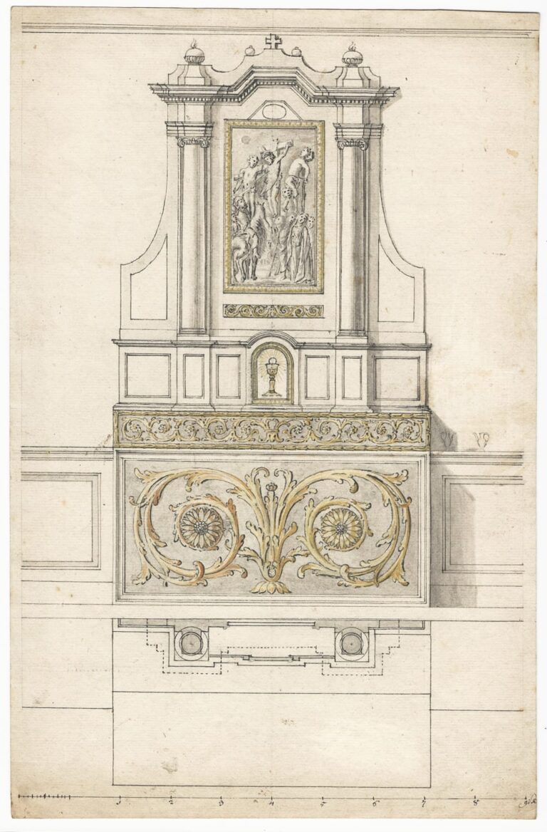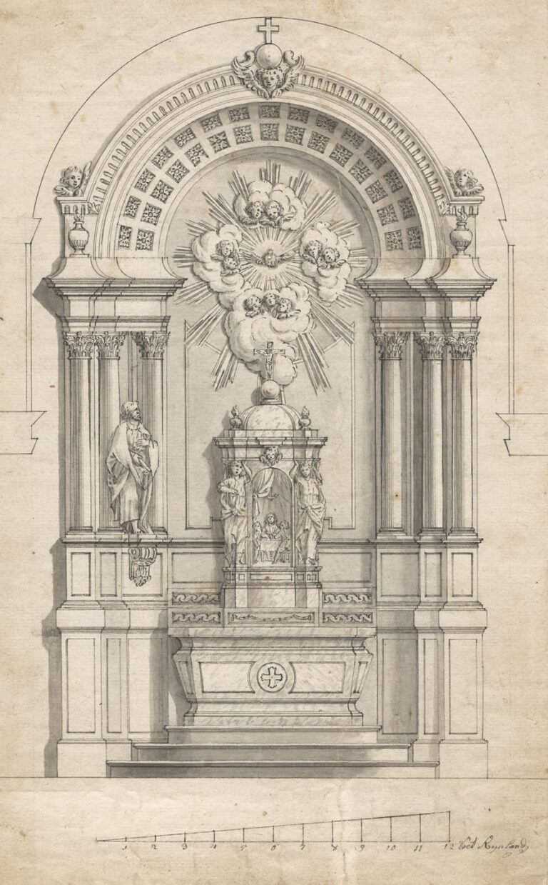 This is a rare group of five designs for altars and a pediment for Roman Catholic churches. Two sheets have indications in ‘Voet Rynlands’, the Rhineland foot, originally used in the Hoogheemraadschap van Rijnland, the area around Leiden, although later the Rhineland foot was adopted by the whole of Holland. The official religion of Holland was Protestantism, although Catholicism was tolerated by authorities, provided the churches were not recognisable as such from their exteriors, which gave birth to the phenomenon of the ‘schuilkerk’. The most famous of these is the Onze-Lieve-Heer-op-Solder in Amsterdam, dating to 1663 and currently a museum.