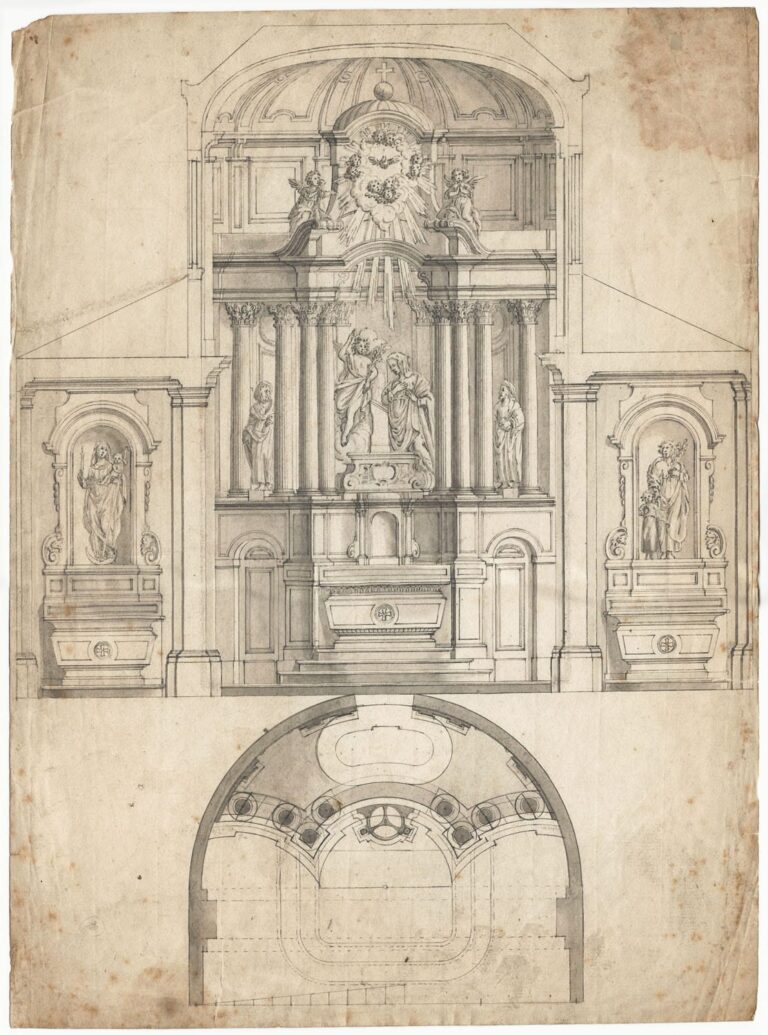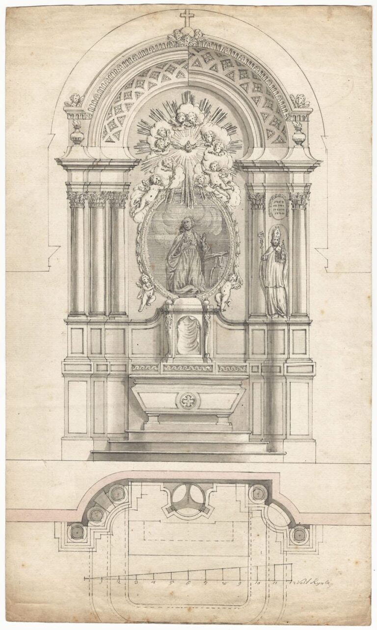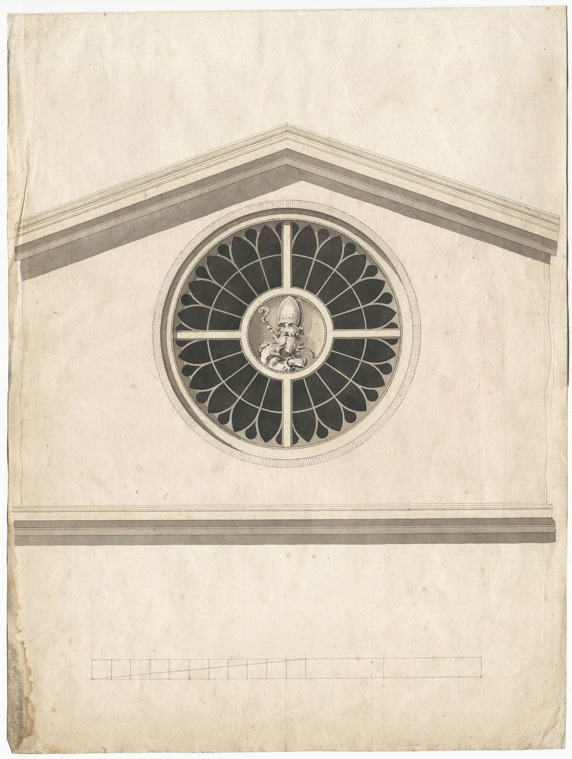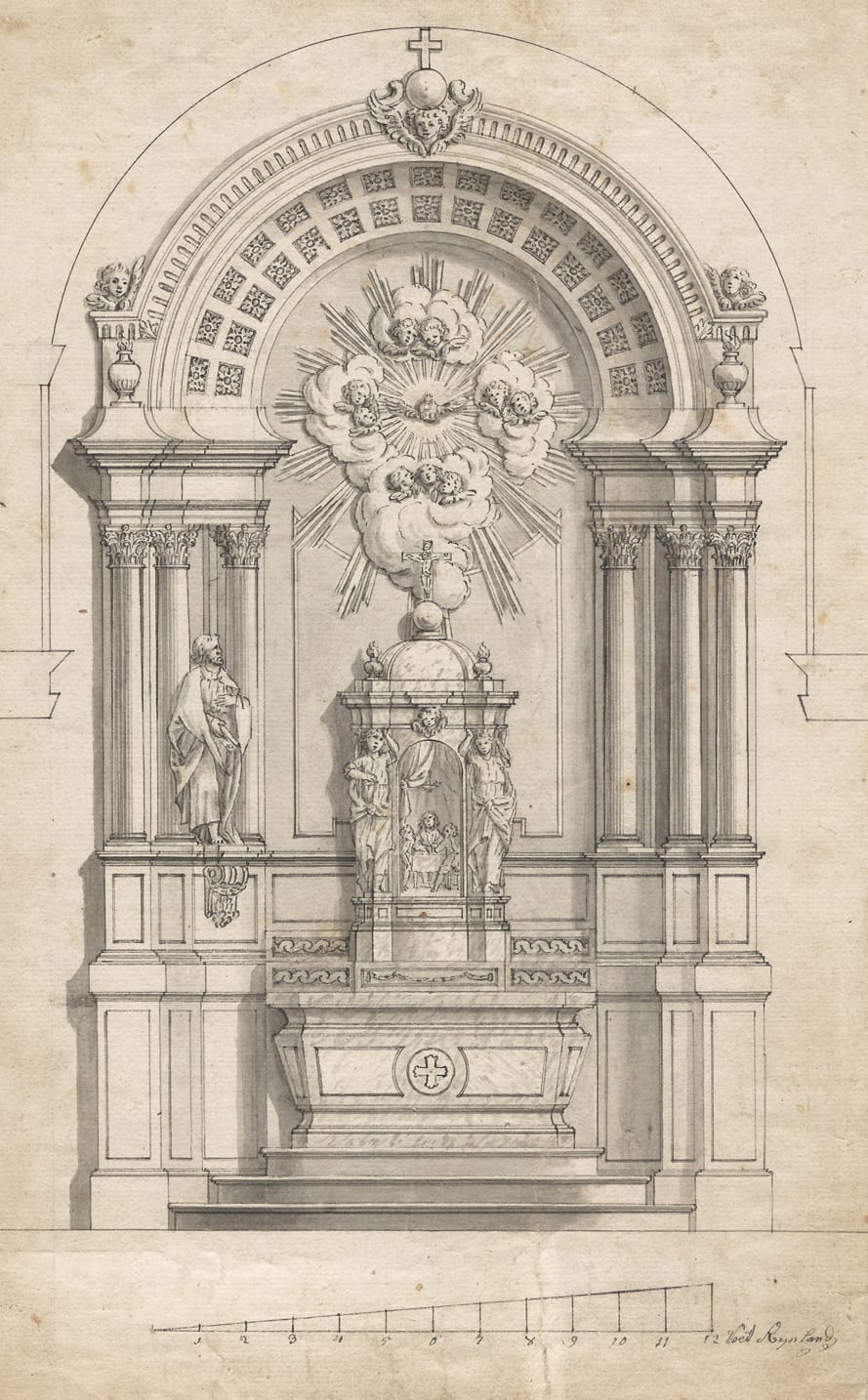During the second half of the eighteenth century, Catholics were however increasingly allowed to build recognisable churches – their rights to do so were officially established in 1798. The designs presented here show exceptionally rich religious interiors, possibly connected with the Catholic church in Rijswijk, built around 1784 (and demolished in 1906).1 The design for the pediment, including a bust of St Willibrordus, who was particularly worshipped in The Netherlands, might date to a slightly later period, and could conceivably be connected to the Old-Catholic Jansenist Church of the Old-Episcopal Clerezij.