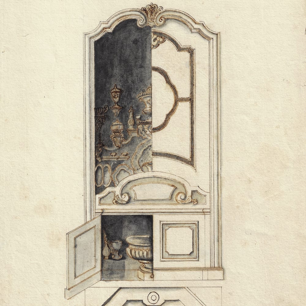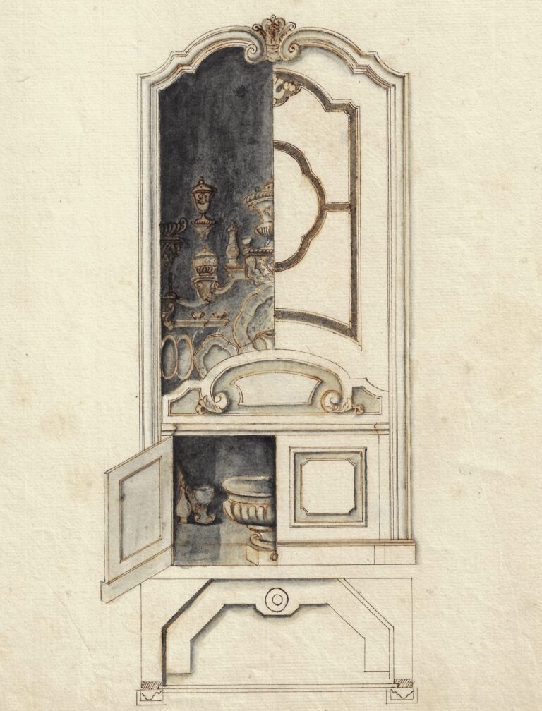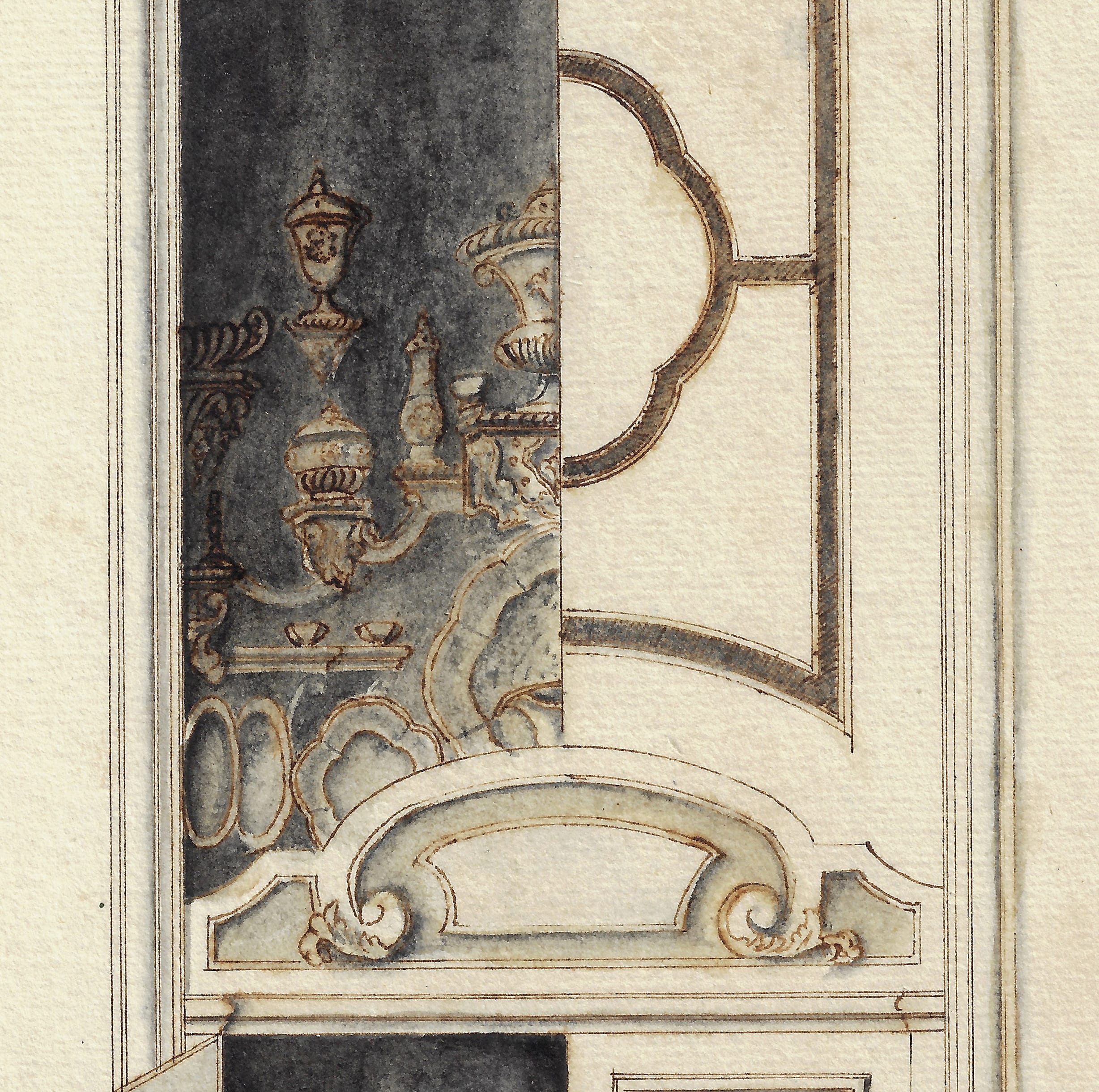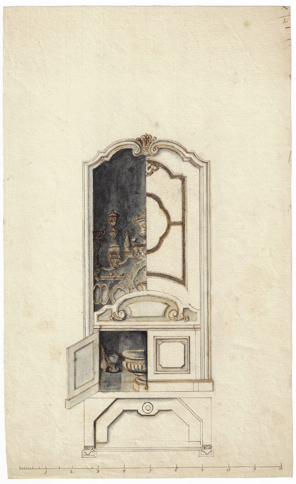 This interesting sheet is a design for a buffet cupboard, intended to be filled with glass and silverware, as is shown in the drawing, which includes an elevation and plan of the buffet. The cupboard consists of two parts: the upper half with what is probably a downward-sliding door, meeting a hinged flap intended to create a larger surface to display pieces of silver or glass. The lower part of the cupboard has two simple doors, and can hold larger pieces, such as the wine cooler shown in the drawing. The drawing is executed in a simple late Baroque style of around 1730, much influenced by Daniel Marot (1661–1752). A comparable design for a buffet by Marot himself is preserved in the Rijksprentenkabinet, Amsterdam.1