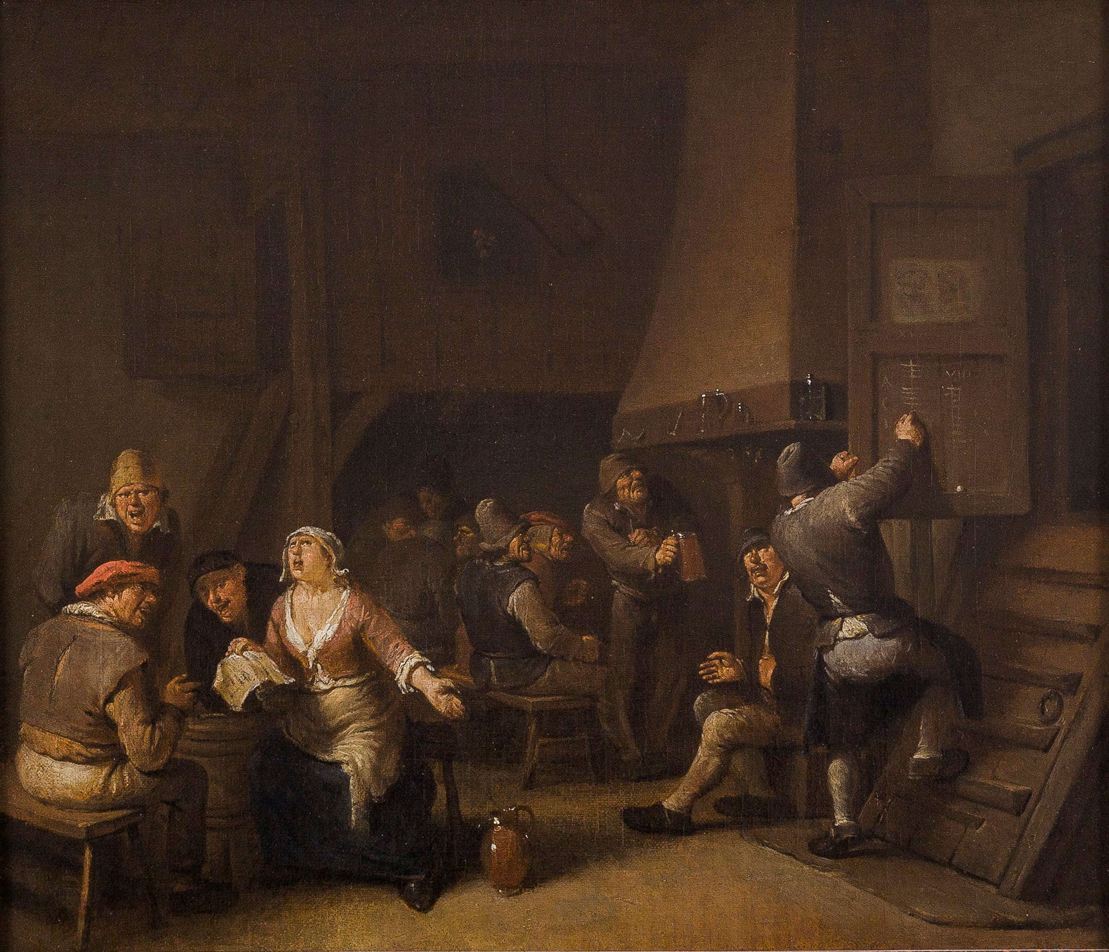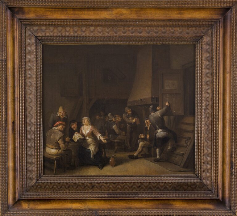In the early 1670s Holland was invaded by French forces, which caused an economic downturn, and Heemskerck emigrated to England. There he worked for John Wilmot, Earl of Rochester, and for an art dealer who was based in the Strand. He later rented attic rooms in the house of a tobacco seller in Drury Lane. Heemskerck’s genre pieces were highly favoured by English patrons, as is beautifully illustrated by this work, which is full of charming details: at the left, four figures are engaged in song, while drinkers are telling stories by the fireplace. A group of figures seems to be playing a game in the back of the room, possibly backgammon, while a figure at the right chalks up the score on the inside of a door. The door is decorated with caricature heads, probably drawings – Heemskerck himself was also an active draughtsman. The artists’s son Egbert II (c.1676– 1744) was trained by his father and worked in his manner, but did not possess his father’s talent.