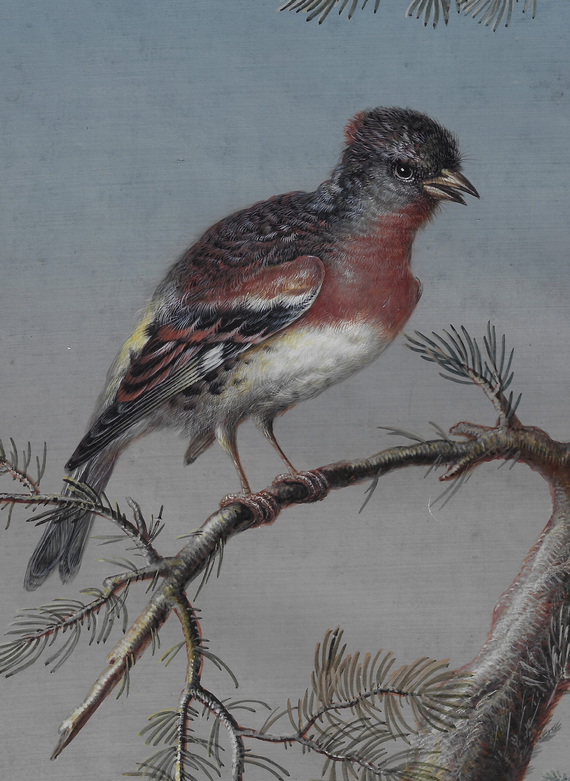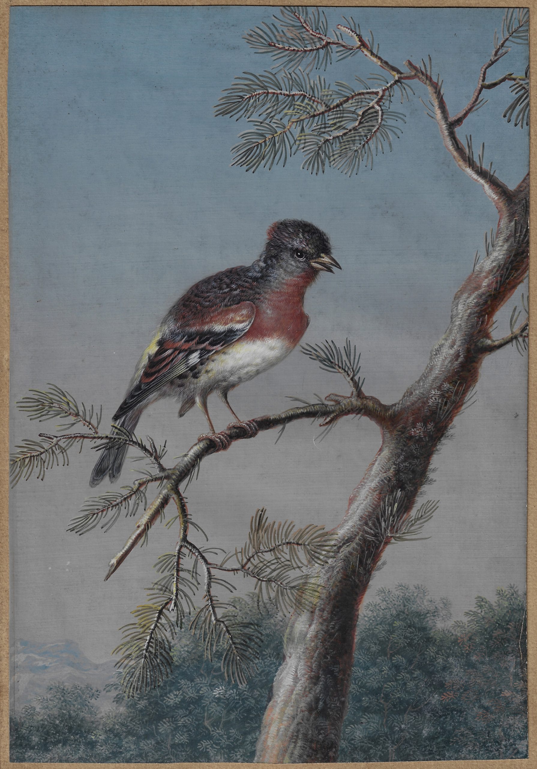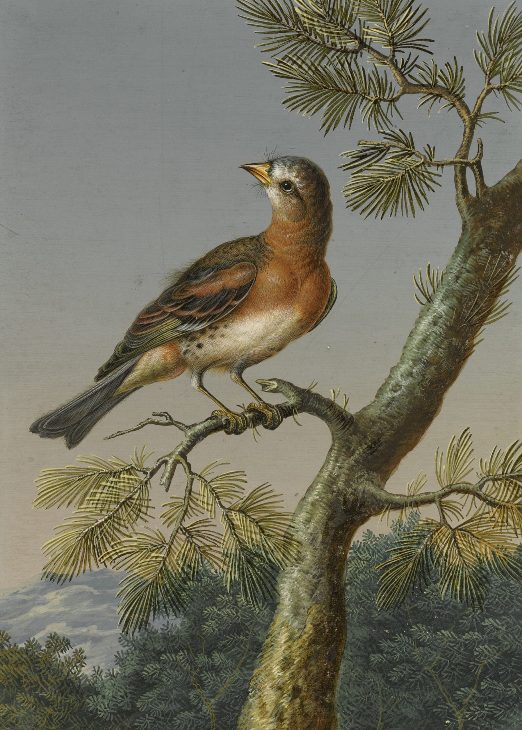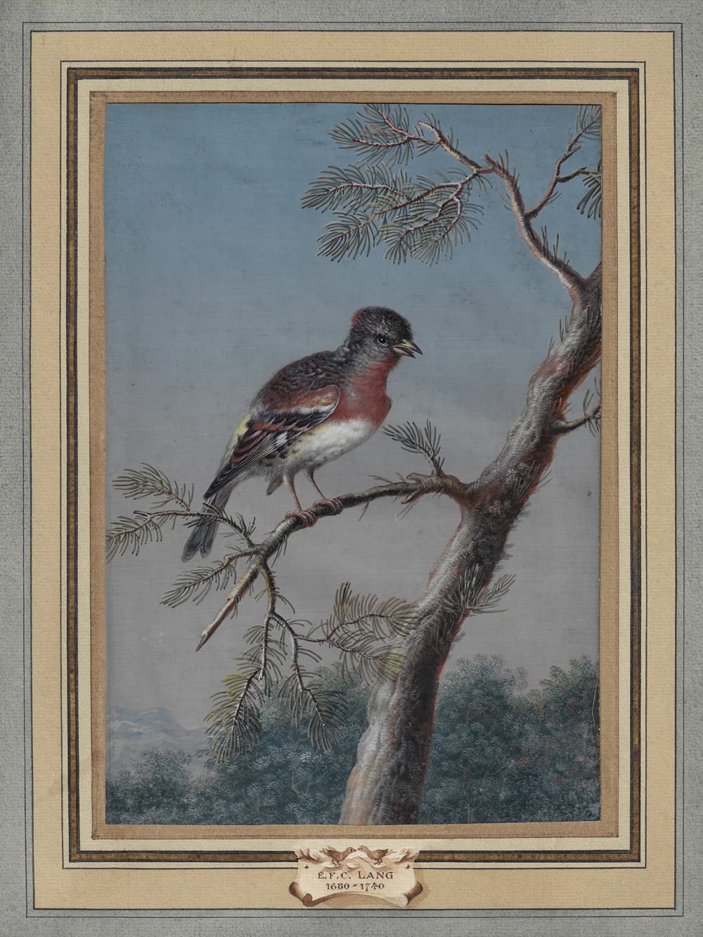 Dietzsch frequently favoured monochromatic backgrounds to her highly realistic depictions of animals and plants, many of which were owned by the Nuremberg physician and botanist Christoph Jacob Trew (1695–1769), while Lang generally employed landscape backgrounds. Lang may also have been inspired by Trew’s collections of naturalia, or indeed have worked for him. His works can be identified by the idiosynchratic delination of the leaves on the branches, which resemble fir branches.