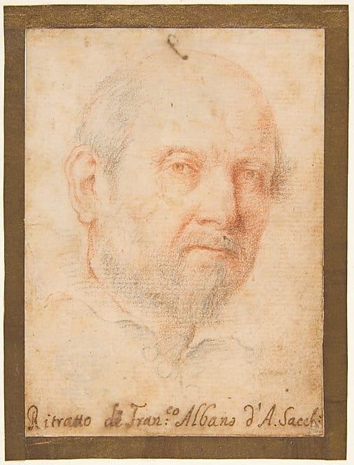 The drawn self-portrait which Resta mentions appears to be lost, but several documented likenesses of Albani are known:5 a painted self-portrait of 1638-38 is in the Pinacoteca Nazionale, Bologna, and a portrait in oils by Andrea Sacchi dated 1635 is in the Prado, Madrid; a further drawn portrait by Sacchi, identified as Albani at early stage, is preserved in the Metropolitan Museum, New York (fig.).6 All these show the artist in more advanced years. His likeness was also recorded by Malvasia in 1678, a ‘handsome young man, vigorous in maturity, and venerable in old age; he had a soft, delicate and light complexion, and a noble bearing, with a solemn and stately mien. He was average in height, somewhat corpulent, but well-built and athletic.’7 Our drawing certainly makes the impression of an informal portrait, and the intense look of the sitter has the appearance of a self-portrait. Although it is difficult to be certain, the slight resemblance of the sitter to the later portraits of Albani might indicate it is indeed a self-portrait, as Resta believed.