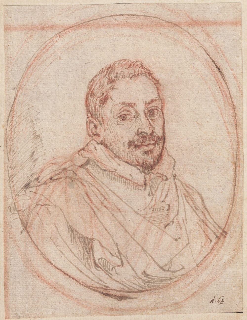 Pen and grey-brown ink over red chalk, in a drawn oval, 178 x 136 mm (7 x 5.3 inch); laid down on Richardson’s mount with framing lines in pen and brown ink and brown wash, 240 x 190 mm (9.4 x 7.5 inch)