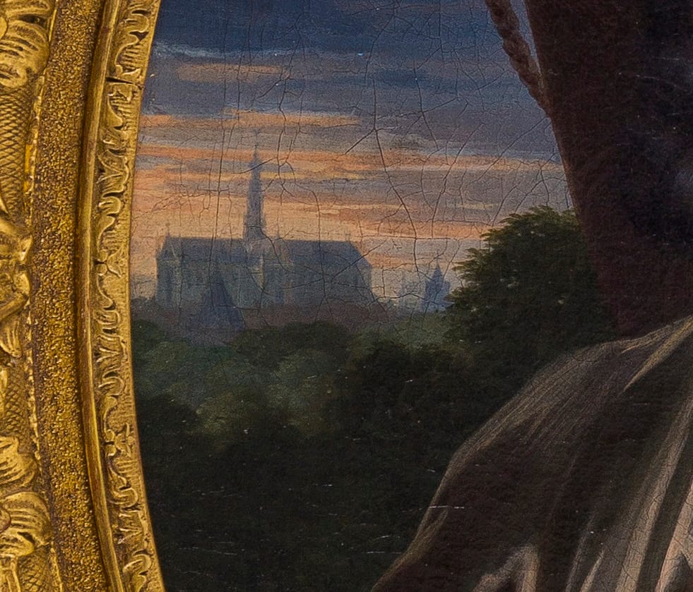 The present painting was recently discovered in a French collection and has been convincingly identified as a work by Decker. The identity of the sitter, with deeply penetrating gaze, wearing a house “rock” and holding a small volume, is sadly no longer known. Beyond him, the profile of the town of Haarlem can be discerned, notably its great St Bavo church.