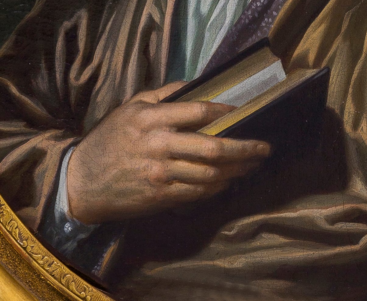 Oil on canvas, oval, 48 x 40.5 cm (18.9 x 15.9 inch); presented in a gilded oval frame of early 18th-century design
