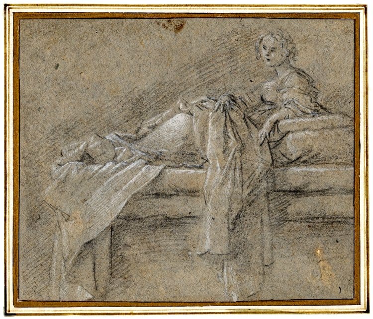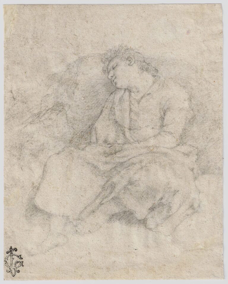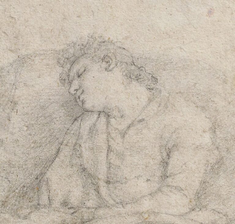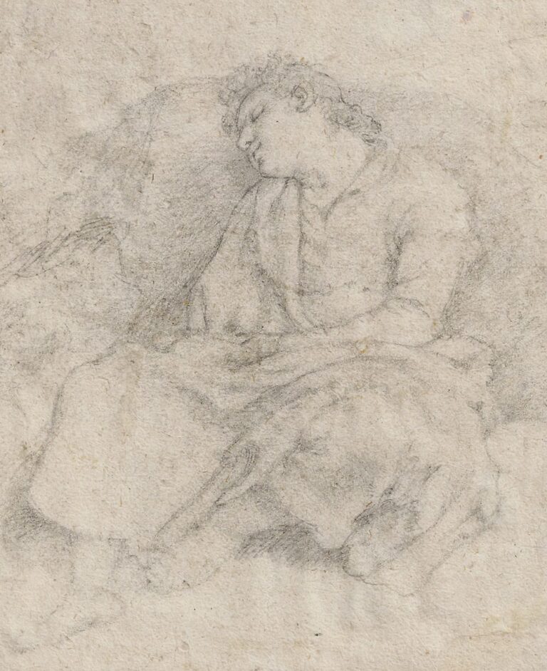 Thematically our drawing may be compared to Baglione’s Woman Reclining on a Bed in the British Museum, which is possibly a study for the figure of St Anne in the background of a painting of the Birth of the Virgin.3 It is also similar to Baglione’s Study of a Girl Sleeping with a Cat in her Arms, sold at Sotheby’s, London, 14 December 1992, lot 1.